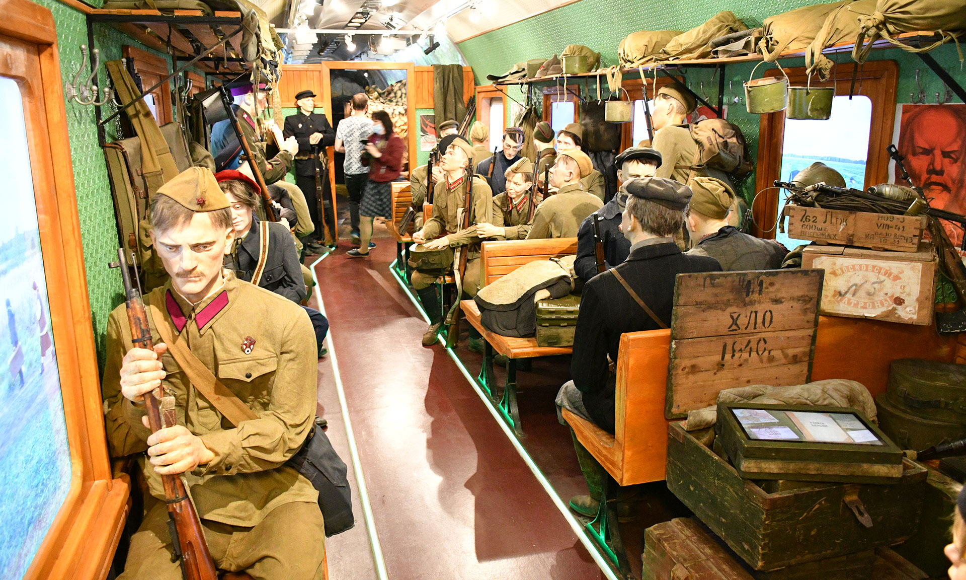 «Поезд Победы» — это первая в мире инсталляция, размещенная в движущемся составе поезда. На сегодняшний день ни в одном музее мира нет такого количества многофигурных композиций в скульптуре, как в «Поезде Победы». Выставочная экспозиция уникальна своим мультимедийным сопровождением. 50 видеопроекторов, 18 видеостен, 12 тач-столов, которые благодаря световым и звуковым эффектам воссоздают захватывающие воздушные бои и массированные танковые атаки, рисуют картины походной солдатской жизни, и тихие воспоминания мирного довоенного времени.