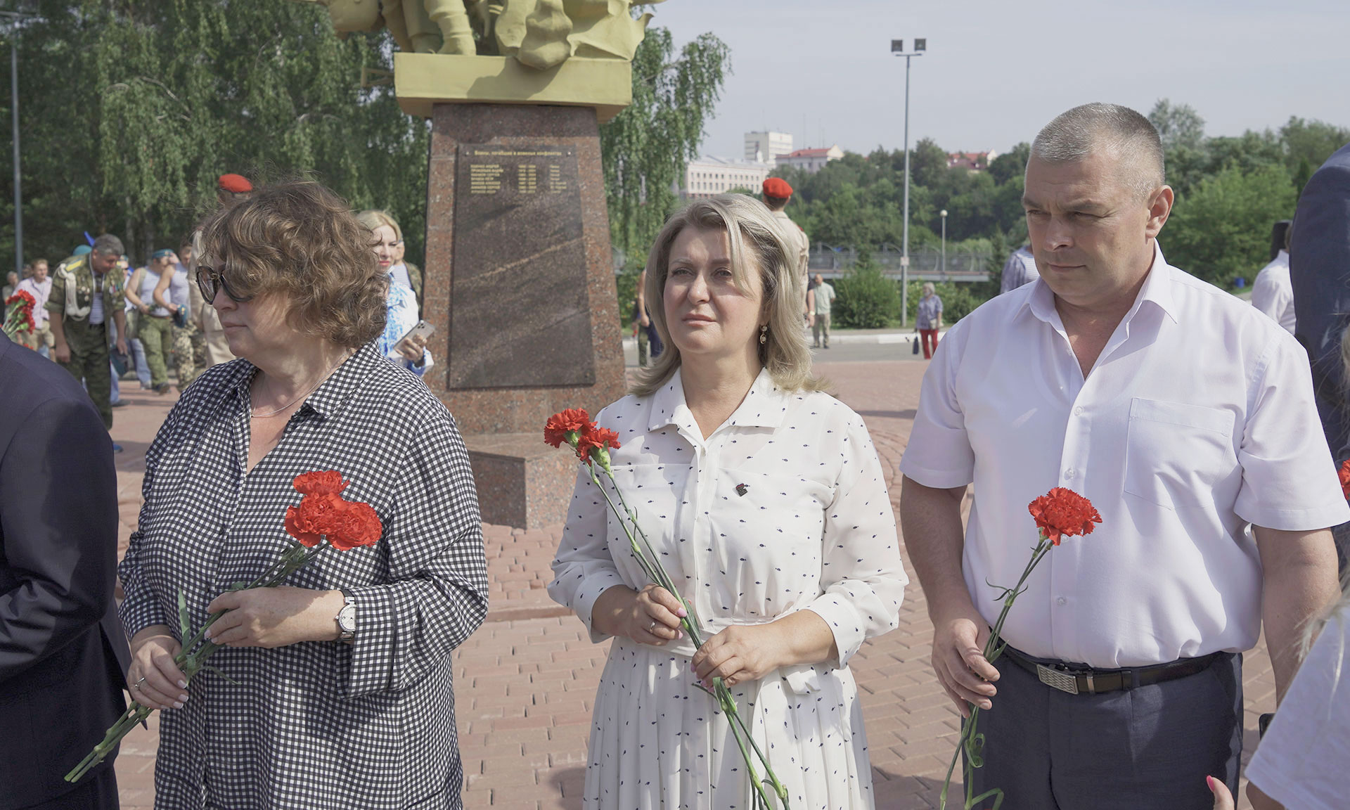 Корзину и цветы к памятнику воинам-интернационалистам возложили врио заместителей Губернатора Брянской области Татьяна Кулешова и Олег Набока, мать Героя России Олега Ермакова, член Общественной палаты Российской Федерации Лидия Филипповна Ермакова, мать Героя России Сергея Василева Галина Георгиевна Василева, первый заместитель председателя комитета Государственной Думы по экологии и охране окружающей среды Николай Валуев, временно исполняющий обязанности военного комиссара Брянской области Василий Загривин, председатель Брянского регионального отделения «Союз десантников» Михаил Амелин, председатель Брянского регионального отделения Общероссийской общественной организации семей погибших при защите Отечества Галина Тарасова, атаман Брянского отдельского казачьего общества Войскового казачьего общества «Центральное казачье войско» Василий Игрунев, эксперт тематической площадки ОНФ «Жилье и городская среда» Николай Алексеенко, заместитель председателя комитета по молодежной политике, физической культуре и спорту Брянской областной думы Вячеслав Губанов, глава города Брянска Марина Дбар, глава Брянской городской администрации Александр Макаров, заведующий отделом Брянской епархии Михаил Агешин, руководители территориальных органов федеральных органов государственной власти в Брянской области, воины-десантники, гости и жители Брянска.