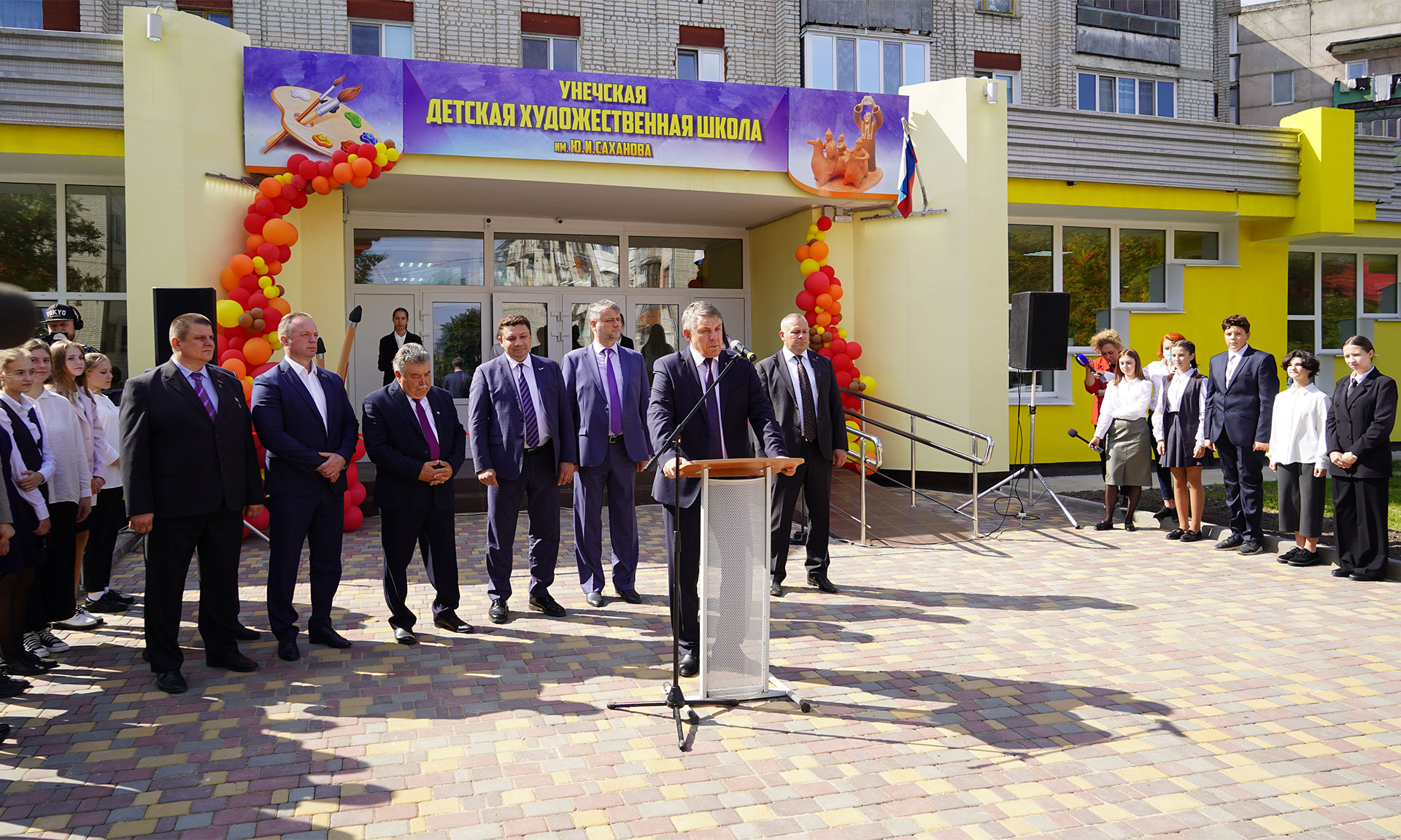— Сегодня мы открываем после капитального ремонта детскую художественную школу имени талантливого педагога Юрия Ивановича Саханова! Задачи, которые ставит Президент нашей страны Владимир Владимирович Путин по созданию современных условий для занятий в школах искусств, мы на Брянщине успешно выполняем. Только за последние два года в Брянской области отремонтировано 8 музыкальных и художественных школ. В ближайшие три года мы должны капитально отремонтировать и оснастить оборудованием еще 15 школ. Объем финансирования только из федерального бюджета составляет 240 млн рублей. И мы эту работу выполним!