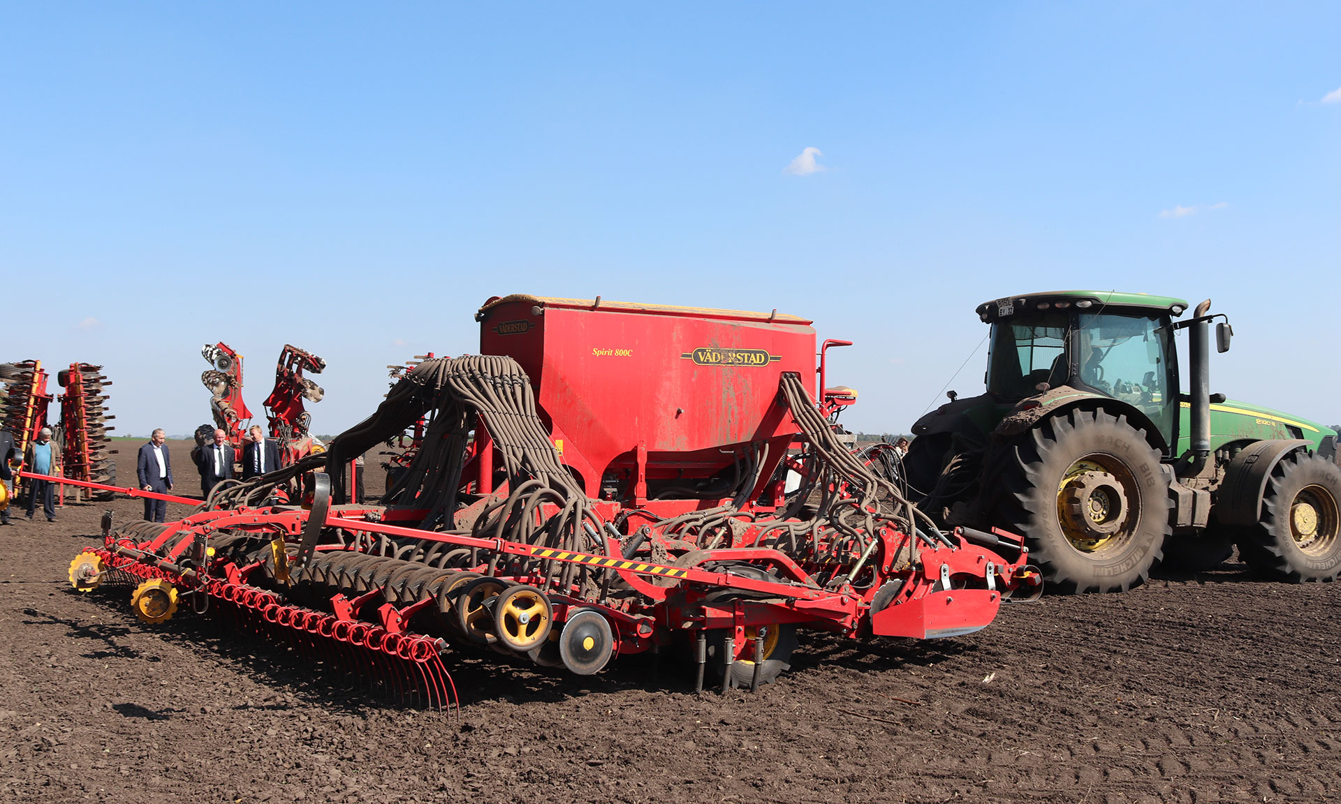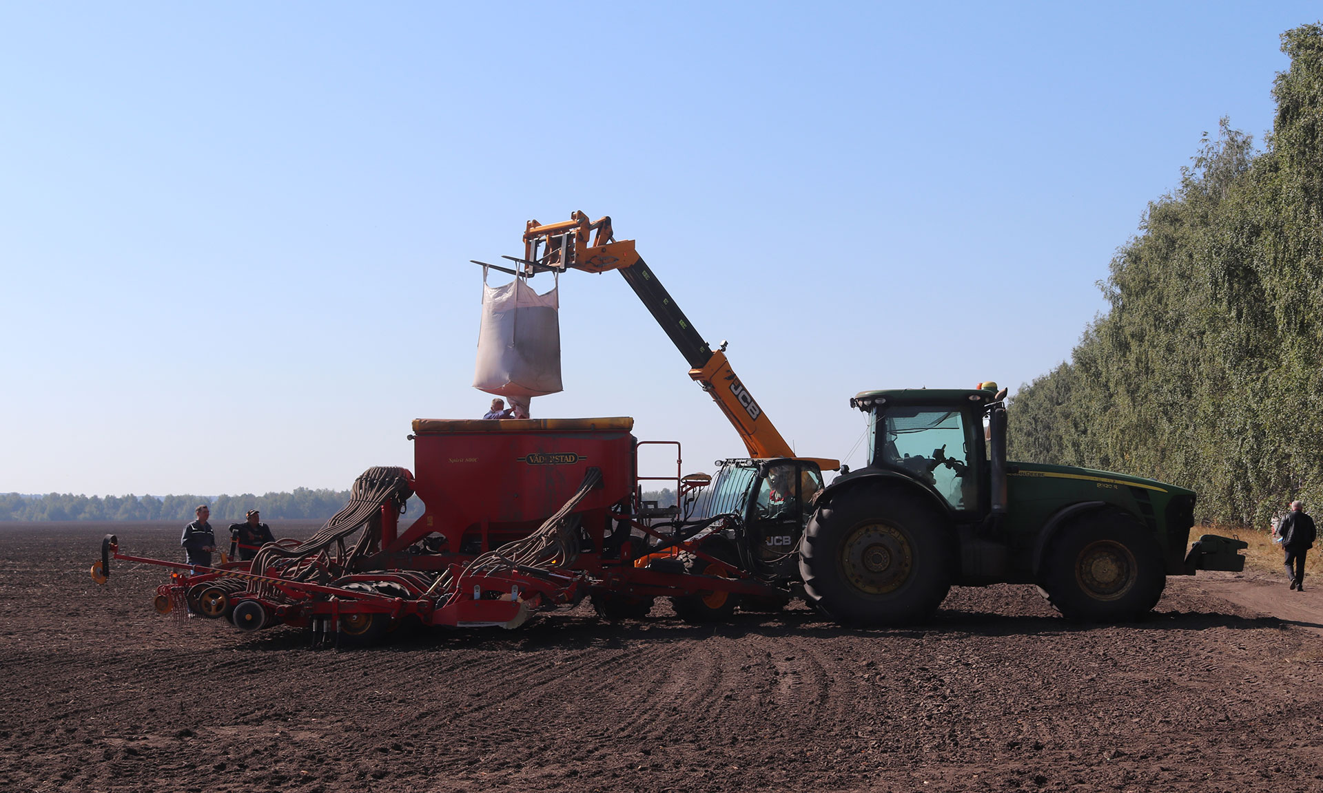 Затем участники семинара увидели воочию, как функционирует зерновой посевной комплекс. Эта техника проводит предпосевную подготовку почвы и осуществляет внесение минеральных удобрений. После внесения семян Иван Фокин и Владимир Ториков с другими участниками семинара провели на поле агрономический контроль качества посева семян озимой пшеницы «Московская 56».