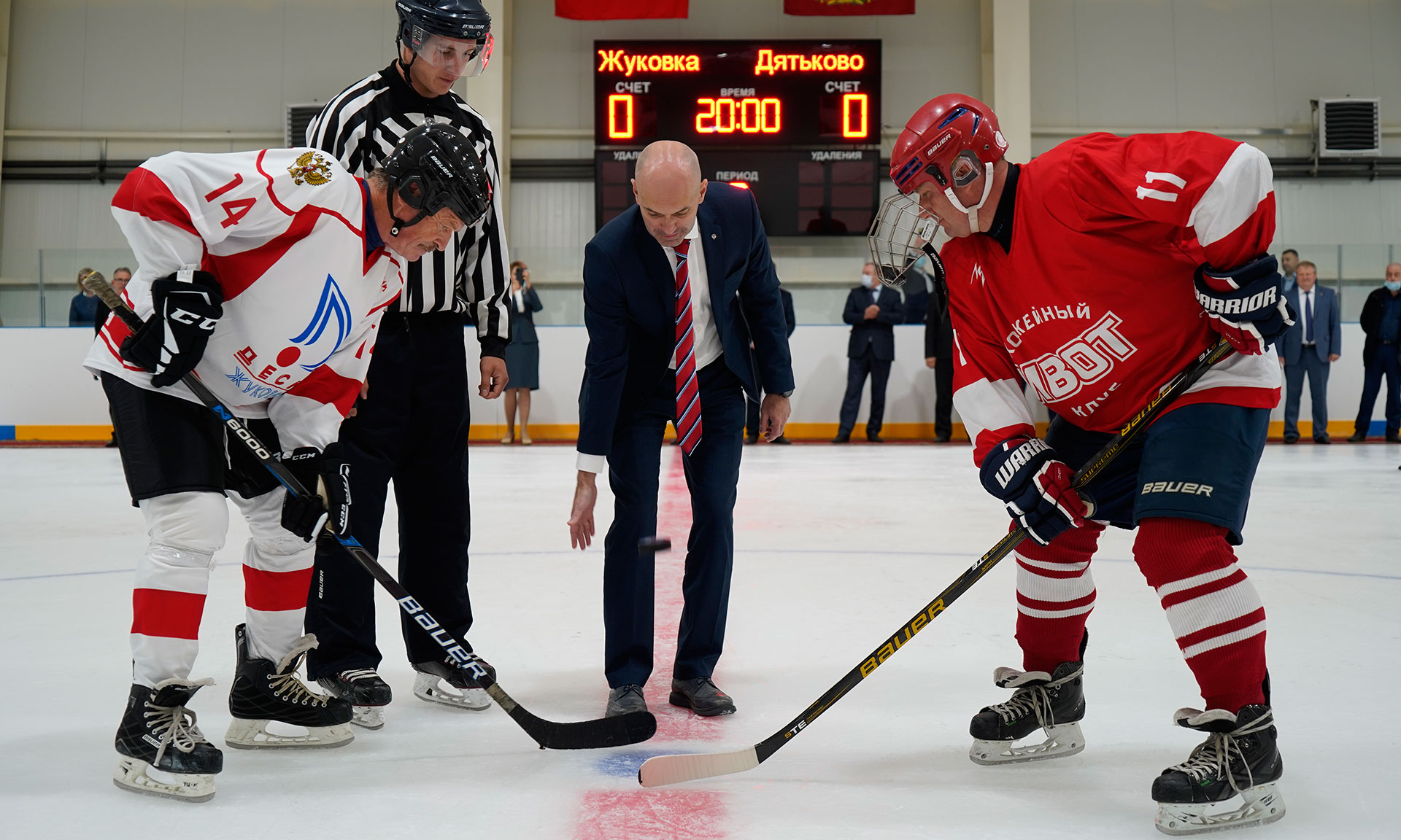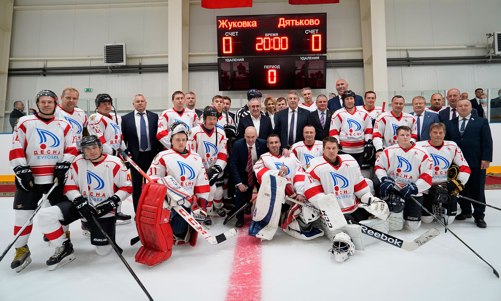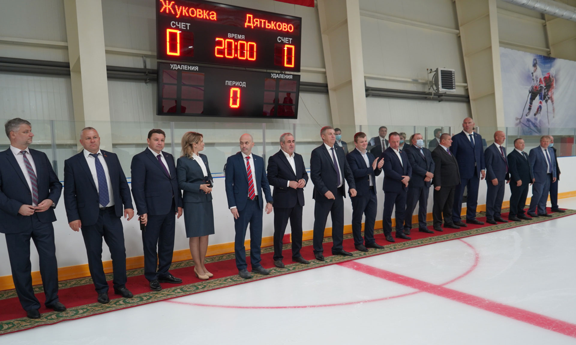 Гости перешли в ледовый дворец, где показательные выступления провели юные фигуристы областного центра. На льду появились хоккейные дружины Дятькова и Жуковки. После совместного фотографирования первое вбрасывание произвёл первый заместитель Министра спорта Российской Федерации Азат Кадыров. Начался первый хоккейный матч в новом ледовом дворце.