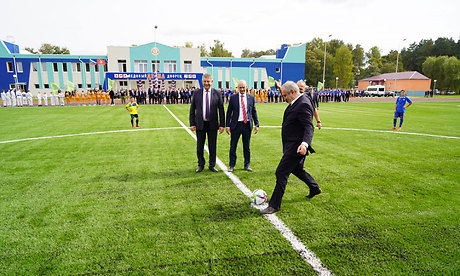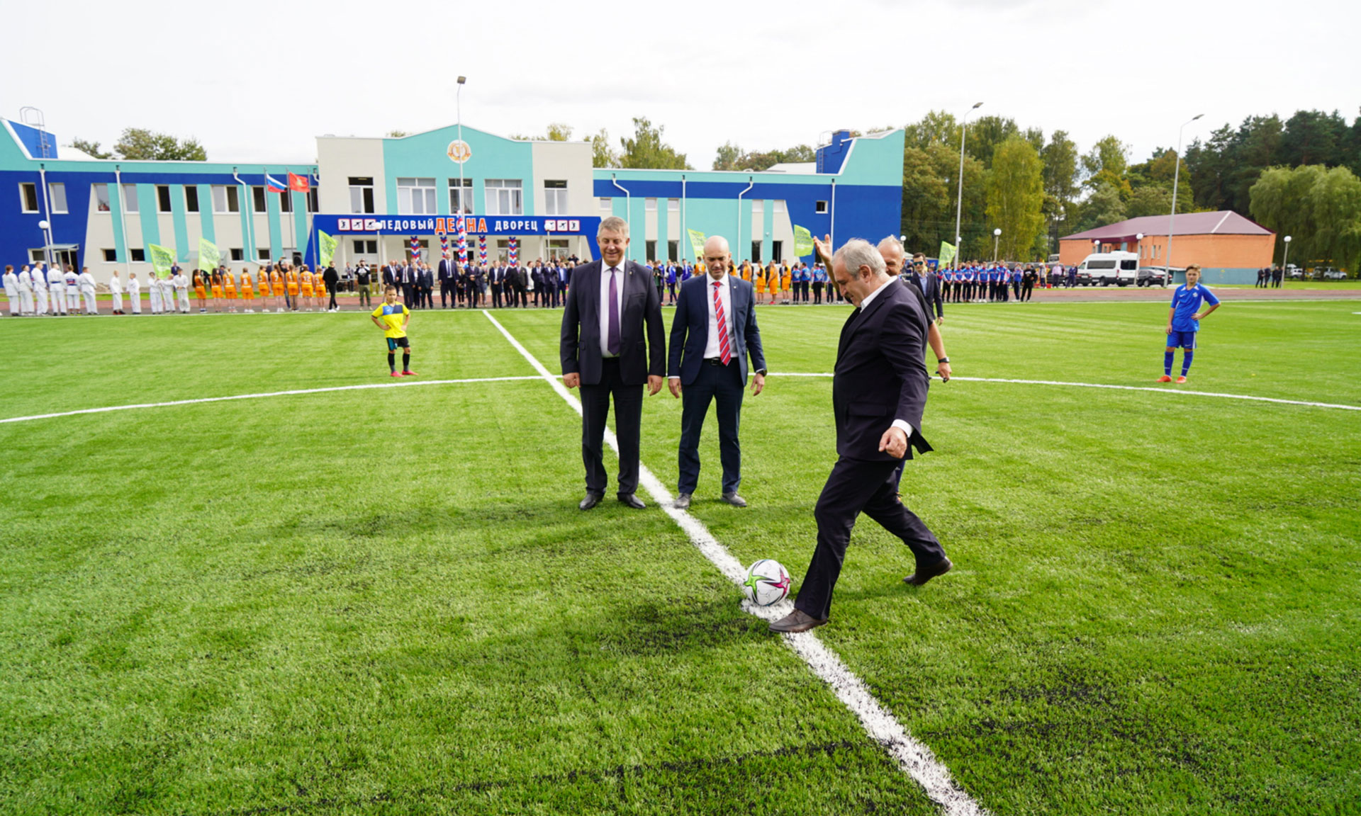 И сегодня здесь мы принимаем в эксплуатацию красавец ледовый дворец, современное футбольное поле с современными беговыми дорожками.