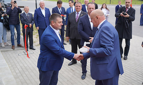 Символический ключ от нового спорткомплекса «Олимп» директору учреждения Максиму Олонцеву вручил Заслуженный и Почетный строитель России, генеральный директор группы компаний «Надежда» Александр Гавричков.