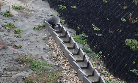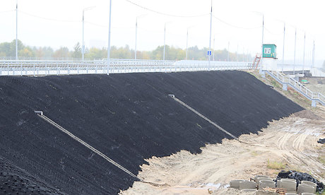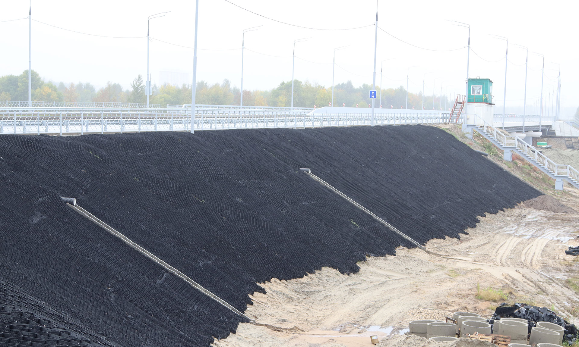 Кроме того, склоны дороги укрепляются геосеткой, ячейки которой засыпаются грунтом и засеиваются травой, образующей густую корневую систему. Всё вместе — построенная водоотводная система, водопропускные трубы и укрепленные склоны — надежно защищают дорогу от размывов.