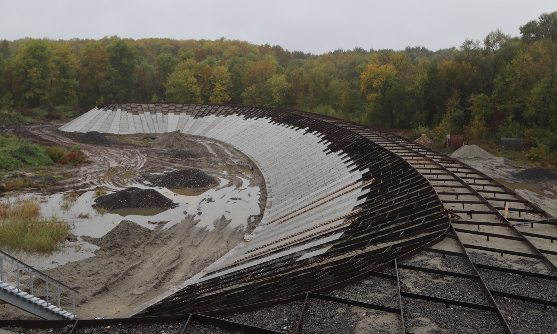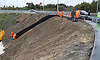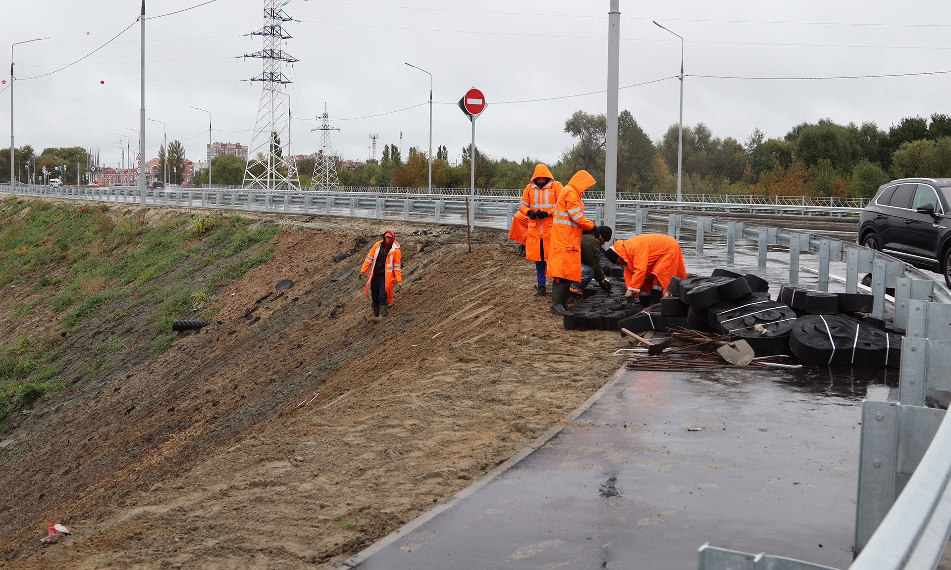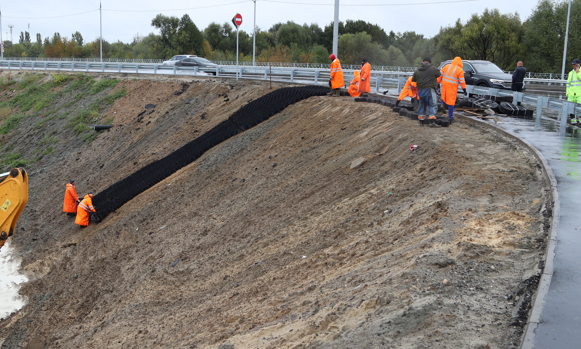 Сегодня утром, как только позволили погодные условия, подрядная организация приступила к ремонту пострадавшего съезда. Техника формирует и уплотняет размытый склон, рабочие настилают геосетку, в течение дня также начнется обустройство водоотводных лотков. Отметим, что работы по восстановлению склона подрядчик выполняет за счет собственных средств. Кроме того, на объекте продолжается строительство струенаправляющих дамб, песчаное тело которых будет заармировано и одето в железобетон.