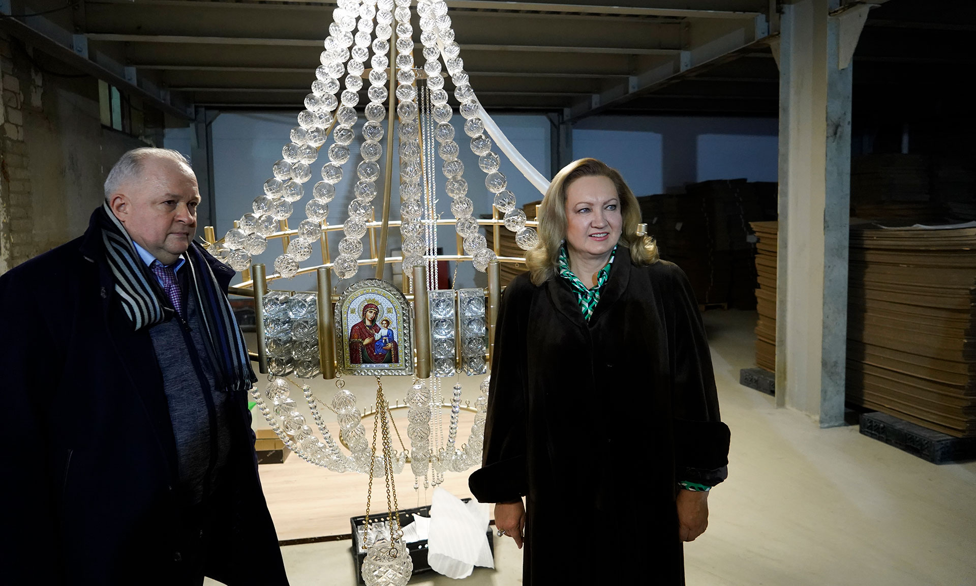 Председателю Наблюдательного Совета Фонда содействия возрождению традиций милосердия и благотворительности «Елисаветинско-Сергиевское просветительское общество» Анне Громовой и заместителю Председателя Правительства Чеченской Республики Джамбулату Умарову показали процесс производства хрустальных изделий.