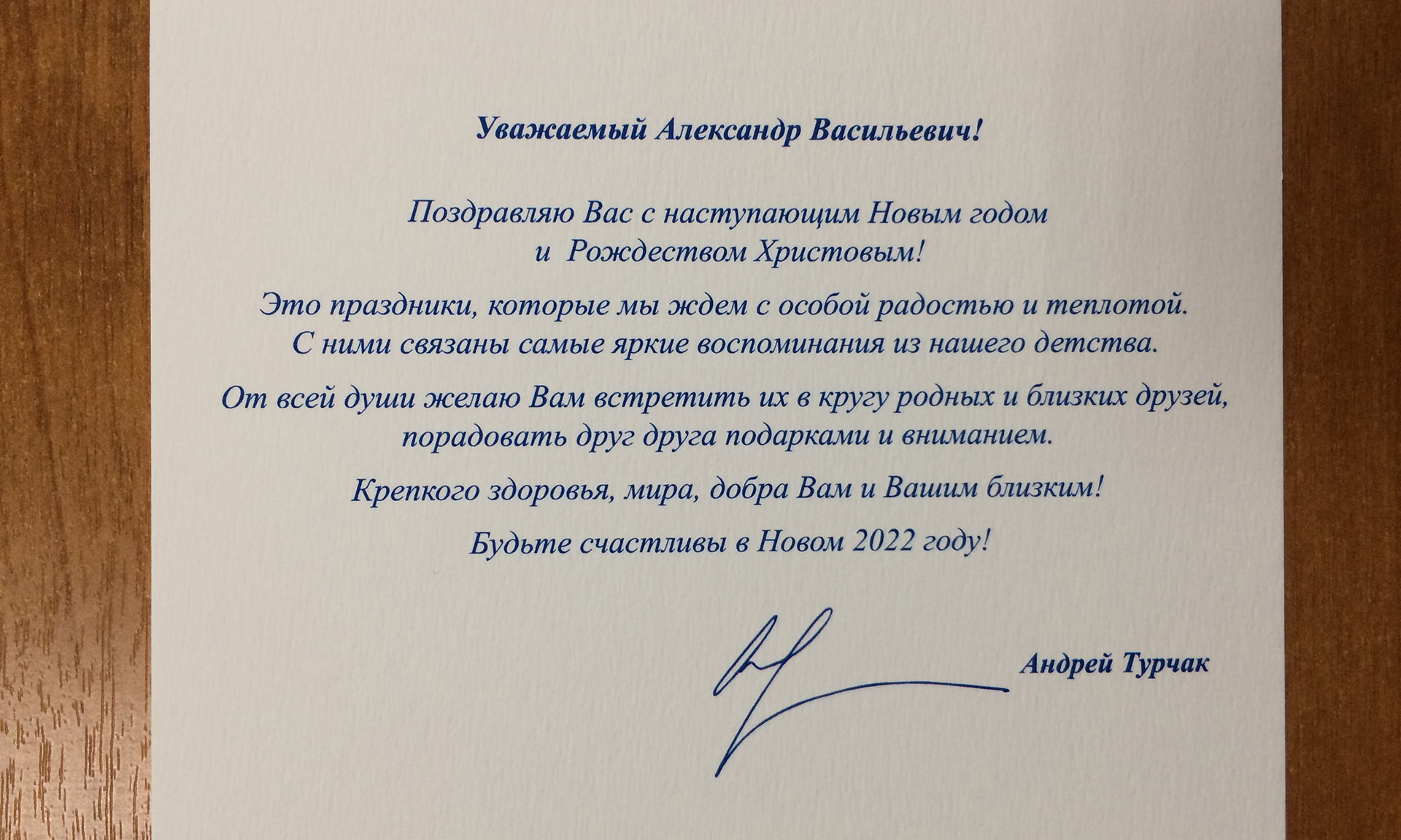 В адрес Александра Богомаза поступило поздравление с Новым годом и Рождеством от первого заместителя председателя Совета Федерации ФС РФ, секретаря Генерального Совета партии «Единая Россия» Андрея Турчака.