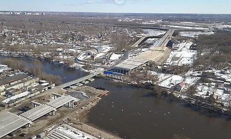 В связи с приближающимся паводком работы в русле Десны приостановлены, однако в соответствии с графиком продолжаются строительные работы на уже сооруженных конструкциях. Сейчас подрядчики занимаются омоноличиванием межбалочных швов, армированием плиты подпорной стенки.