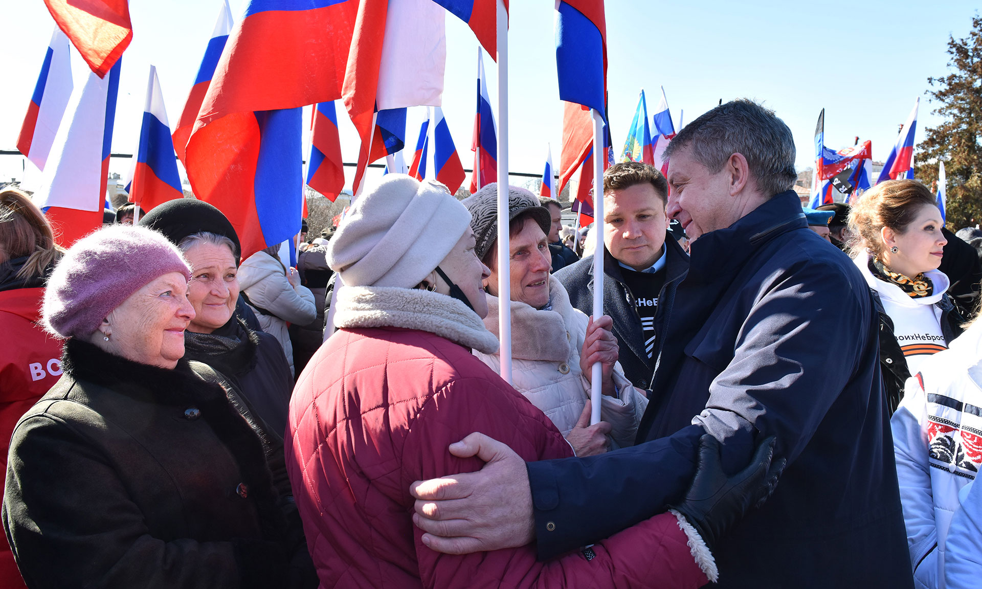 — Добрый день, дорогие земляки! Сегодня мы собрались на Славянской площади, чтобы отметить восьмую годовщину воссоединения Крыма с Россией. Вместе мы — великая страна. Сегодня мы стали едины и с народом Донбасса. И вместе мы встречаем большую русскую весну!