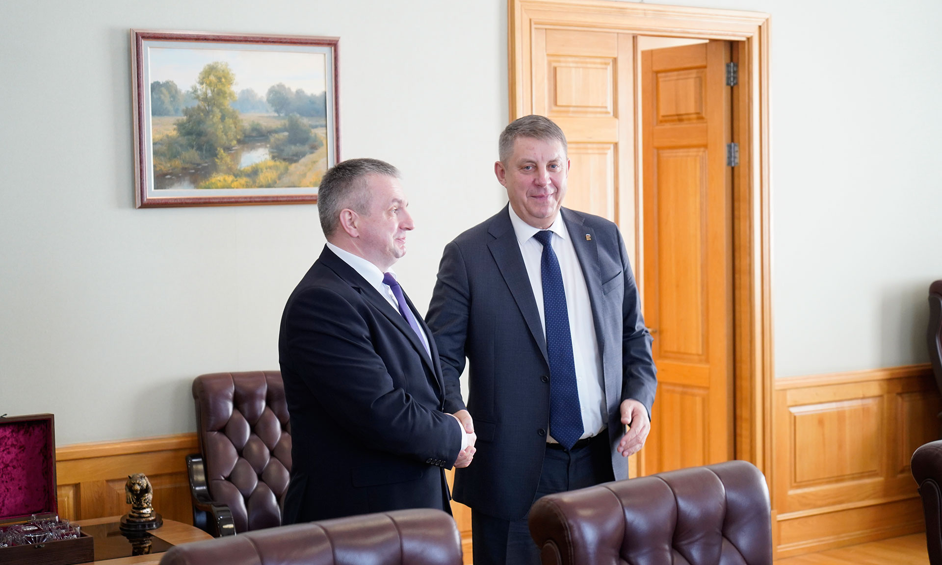 25 марта в Правительстве Брянской области состоялась рабочая встреча Губернатора Брянской области Александра Богомаза с делегацией Республики Беларусь, которую возглавляет председатель Гомельского облисполкома Иван Крупко.