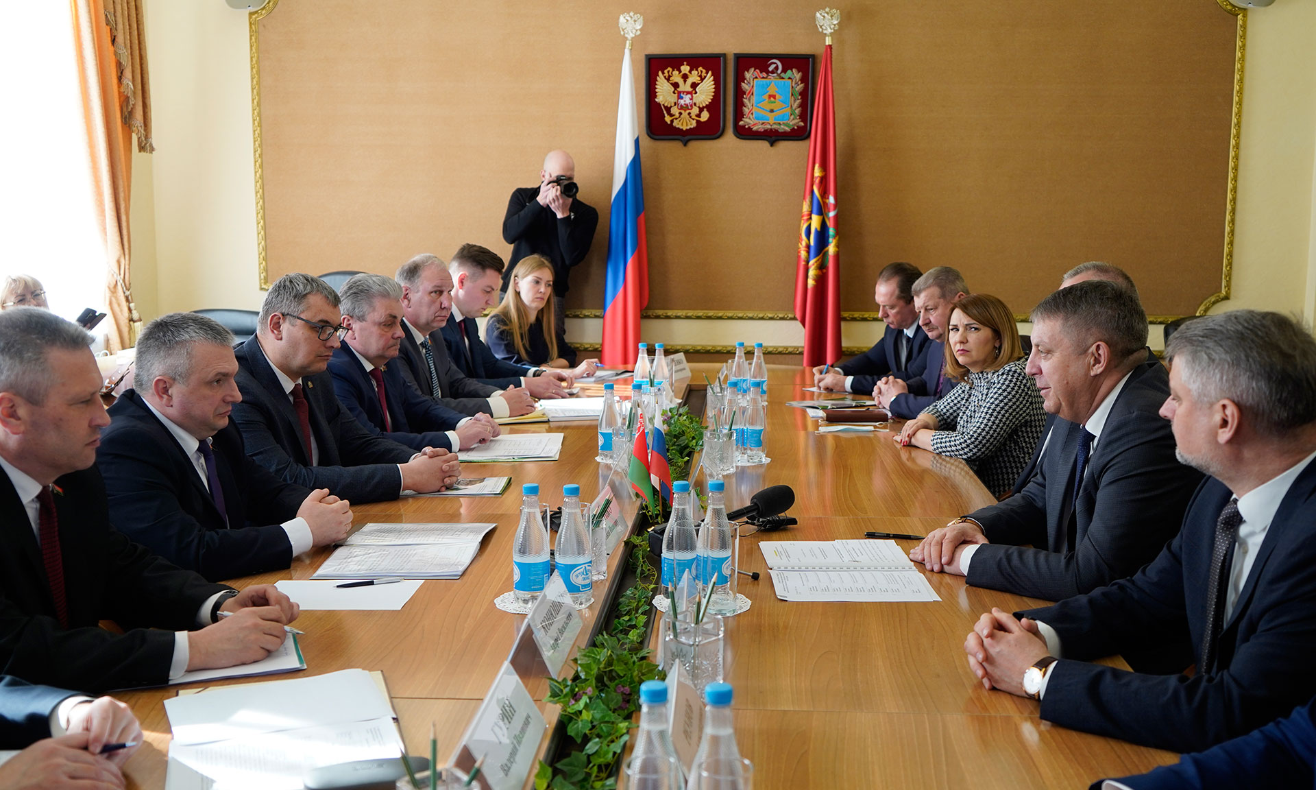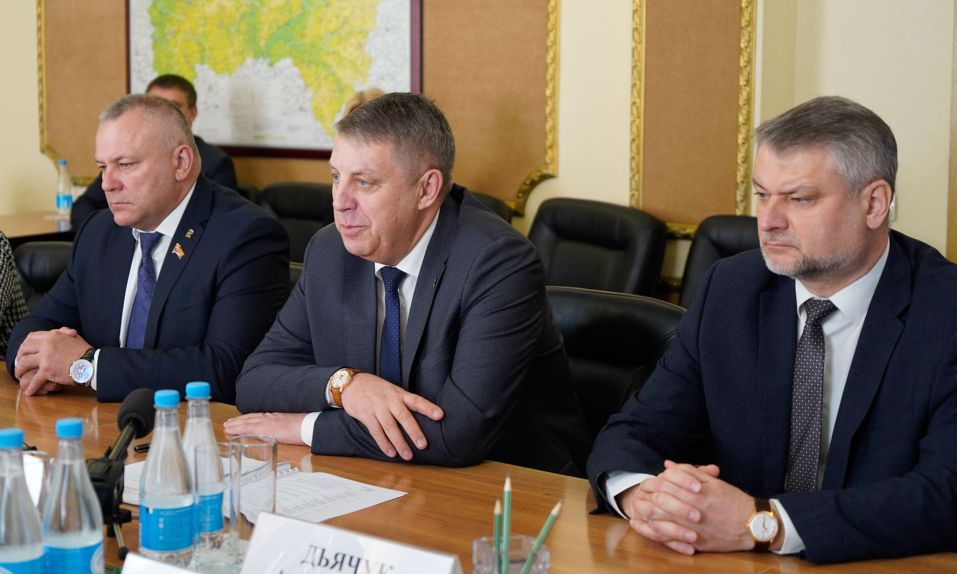У нас в сегодняшней встрече, как и у вас, принимает участие тоже большая делегация, в которую входят представители власти Брянской области: председатель Брянской областной Думы Валентин Владимирович Суббот, главный федеральный инспектор Андрей Сергеевич Дьячук, сенатор Российской Федерации Галина Николаевна Солодун, а также мои заместители по направлениям сотрудничества.