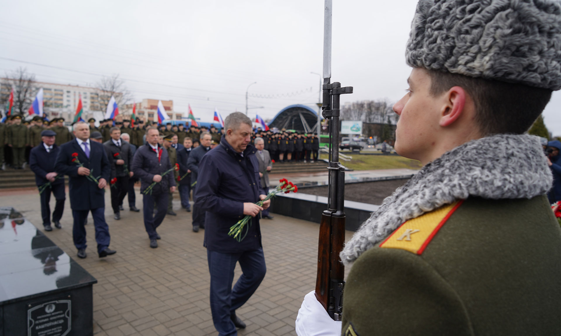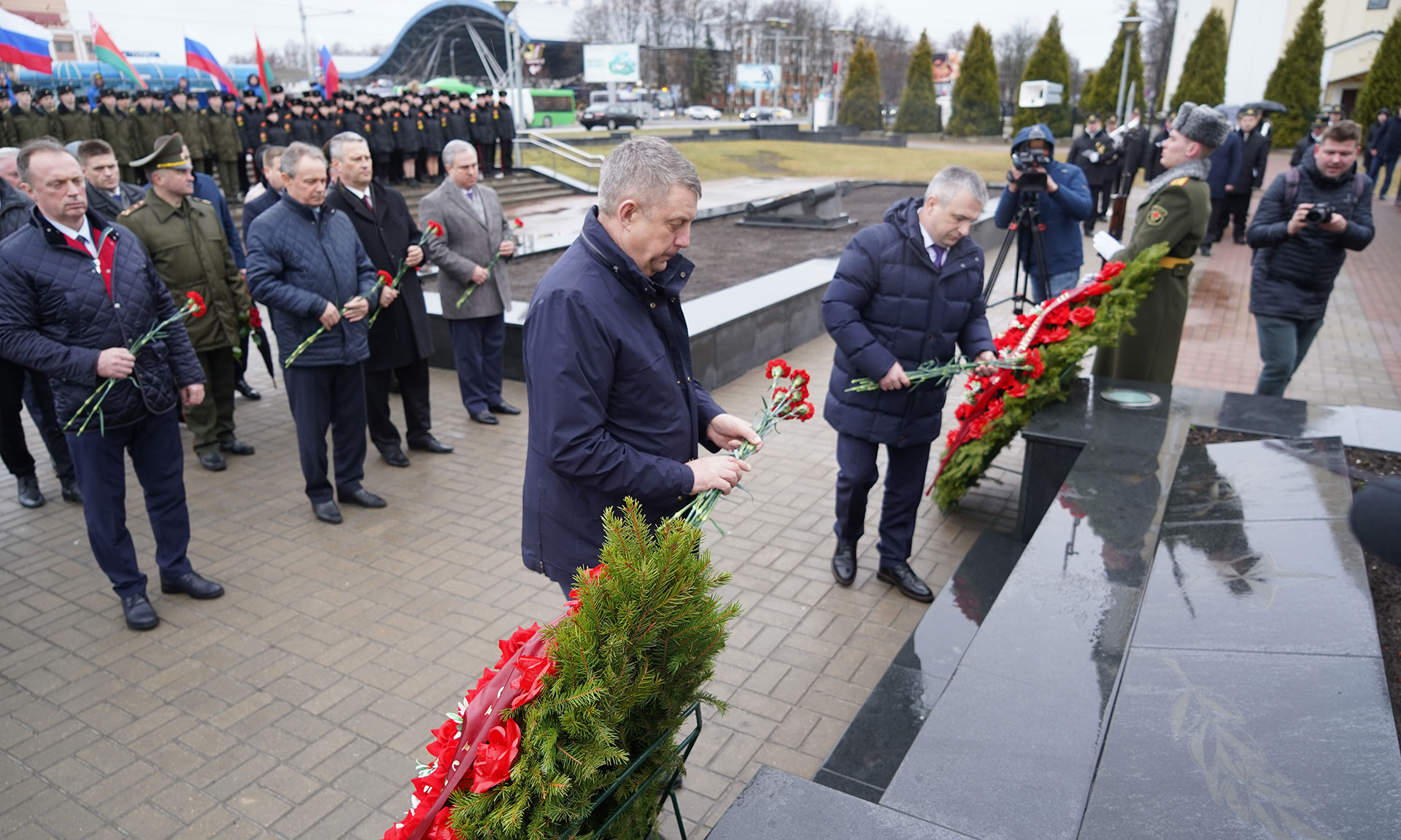 Память воинов-освободителей, павших за свободу и независимость нашей Родины, почтили Губернатор Брянской области Александр Богомаз, председатель Гомельского областного исполнительного комитета Иван Крупко, председатель Брянской областной Думы Валентин Суббот, заместители Губернатора Брянской области Борис Грибанов, Николай Лучкин, заместитель председателя Брянской областной Думы председатель постоянного комитета Брянской областной Думы по промышленности, строительству, связи, предпринимательству и собственности Сергей Антошин.