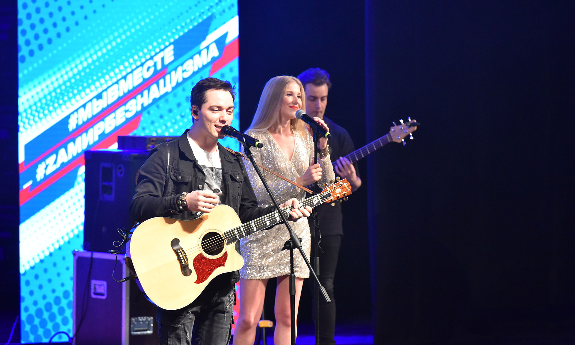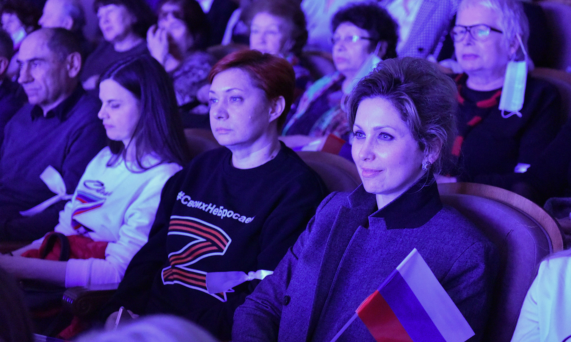 Перед началом концерта волонтеры культуры вынесли на сцену флаги Российской Федерации и Брянской области. Сегодня всем жителям России небезразлично то, что происходит во всем мире. Мы с гордостью смотрим на тех, кто выполняет свой долг, защищая наших соотечественников. Началась музыкальная программа с исполнения гимна Российской Федерации.