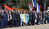 Вдоль строя парадных расчетов перед ветеранами и почетными гостями Государственный Флаг России и Знамя Победы несли лучшие военнослужащие войсковой части 42685: командир знаменной группы Государственного Флага Российской Федерации старший лейтенант Виктор Бирюков, старший лейтенант Евгений Агеев, командир знаменной группы Знамени Победы капитан Игорь Довгалюк, лейтенант Антон Мастеренко.