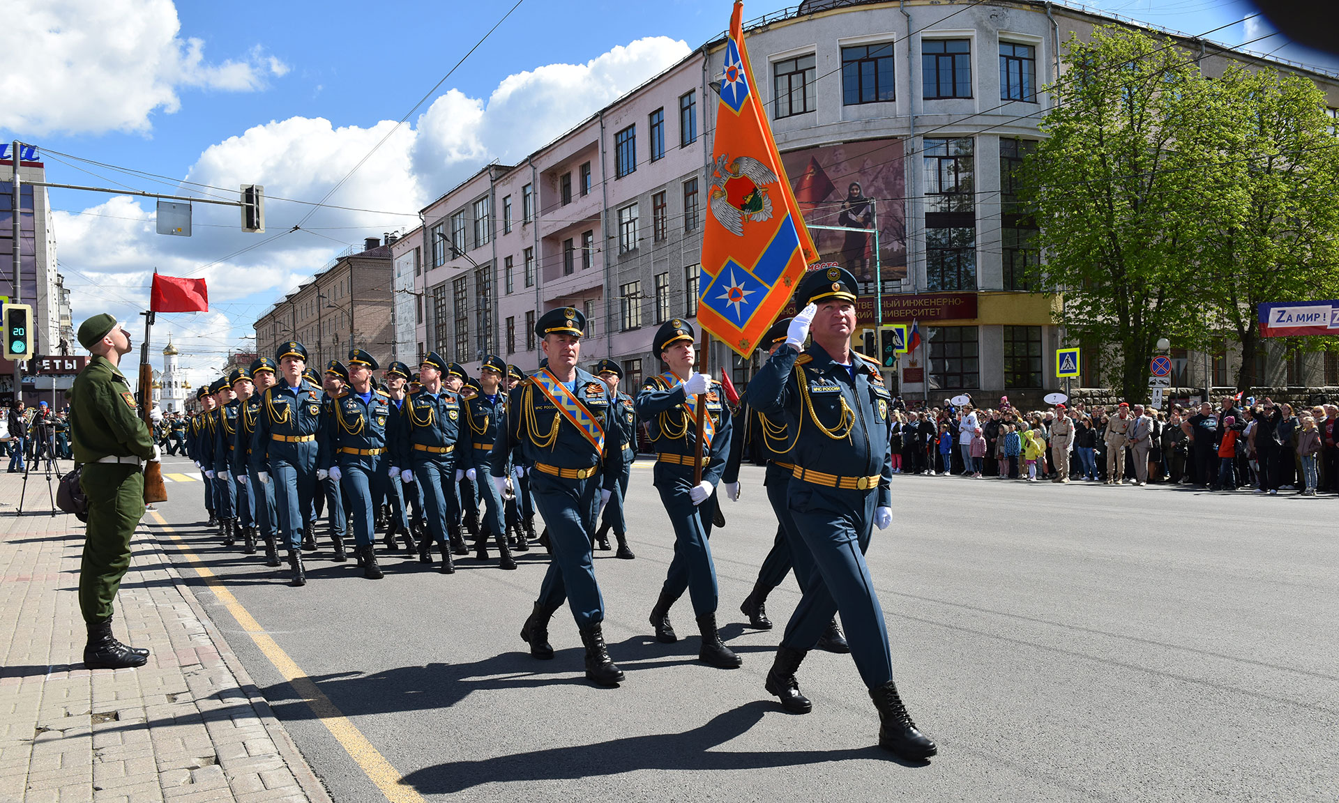 По площади прошел расчет Главного управления МЧС России по Брянской области. В строю — пожарные и спасатели, принимавшие участие в гуманитарных операциях, ликвидации последствий чрезвычайных ситуаций, тушении крупных и сложных пожаров. Колонну возглавил заместитель начальника Управления материально-технического обеспечения полковник внутренней службы Борис Васечкин. Завершил торжественный марш войск Брянского территориального гарнизона и силовых ведомств Брянской области сводный военный оркестр. Военный дирижер — майор Никита Иванов.