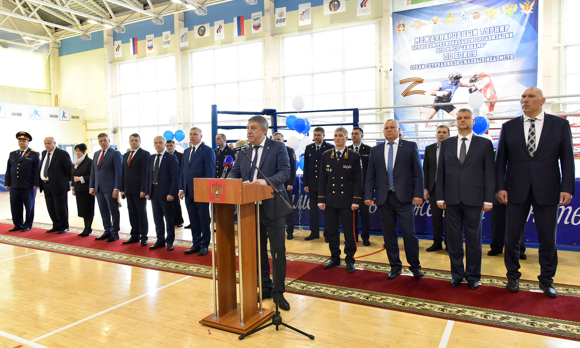 — Уважаемый Александр Васильевич, дорогие друзья! Я рад приветствовать сегодня на гостеприимной Брянской земле участников и гостей международного турнира по боксу среди силовых структур. Отрадно, что этот турнир посвящен нашей великой Победе, 77-й годовщине Победы в Великой Отечественной войне.