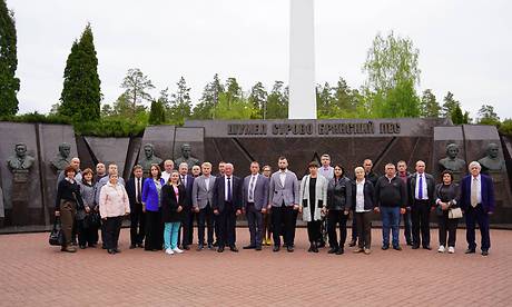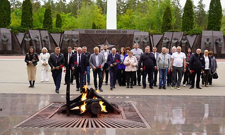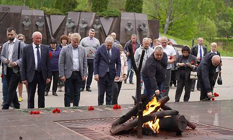 Министр сельского хозяйства и продовольствия Луганской Народной Республики Юрий Пронько, Министр агропромышленной политики и продовольствия Донецкой Народной Республики Артем Крамаренко, представители делегаций республик Донбасса возложили цветы к монументу и почтили память погибших Героев минутой молчания.