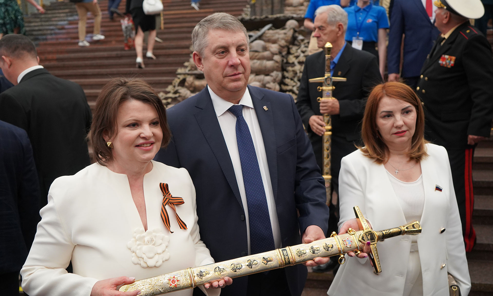 Мечи Победы вручили Герои России — сенаторы РФ Юрий Воробьев, Виктор Бондарев, Александр Карелин, Дмитрий Перминов. Меч Победы был вручен главе города Брянска Марине Дбар.