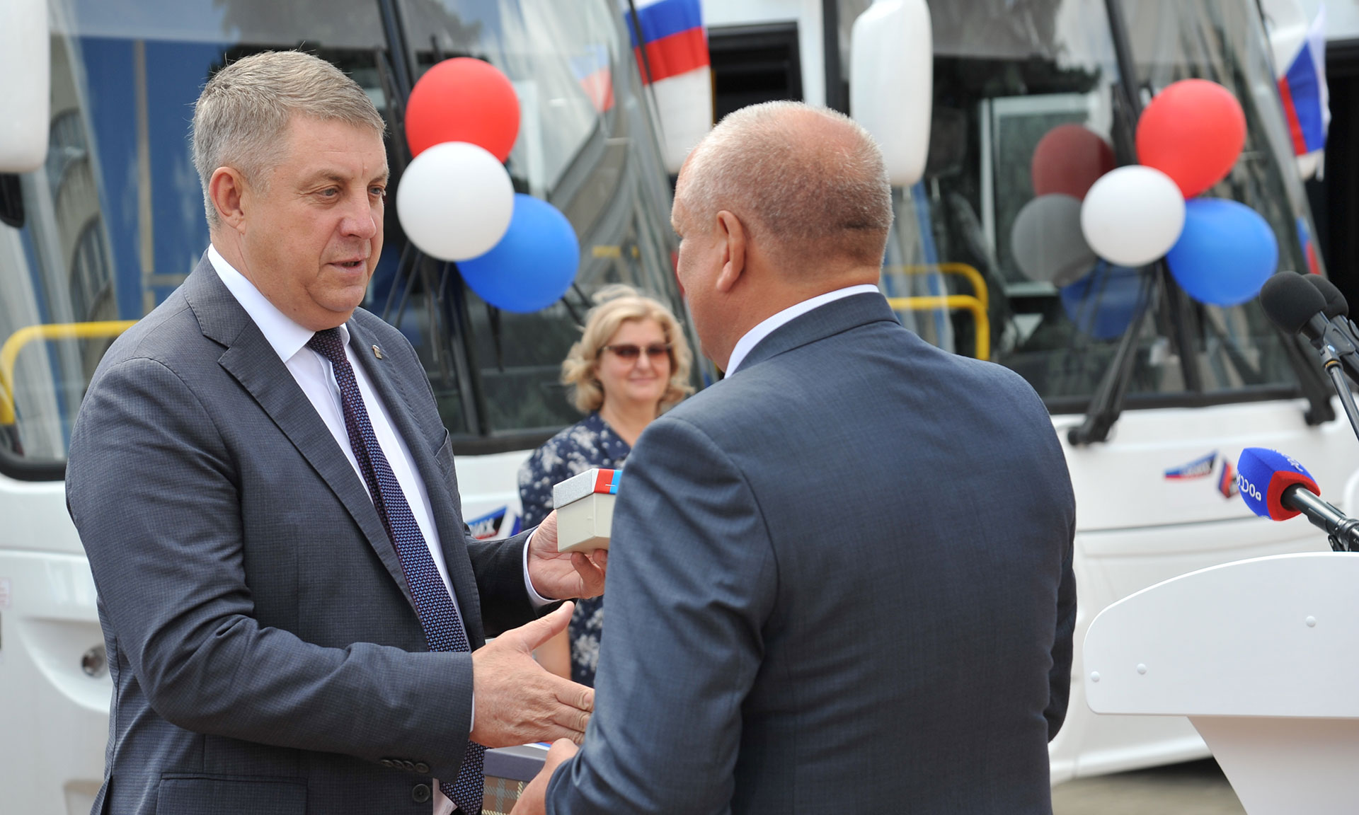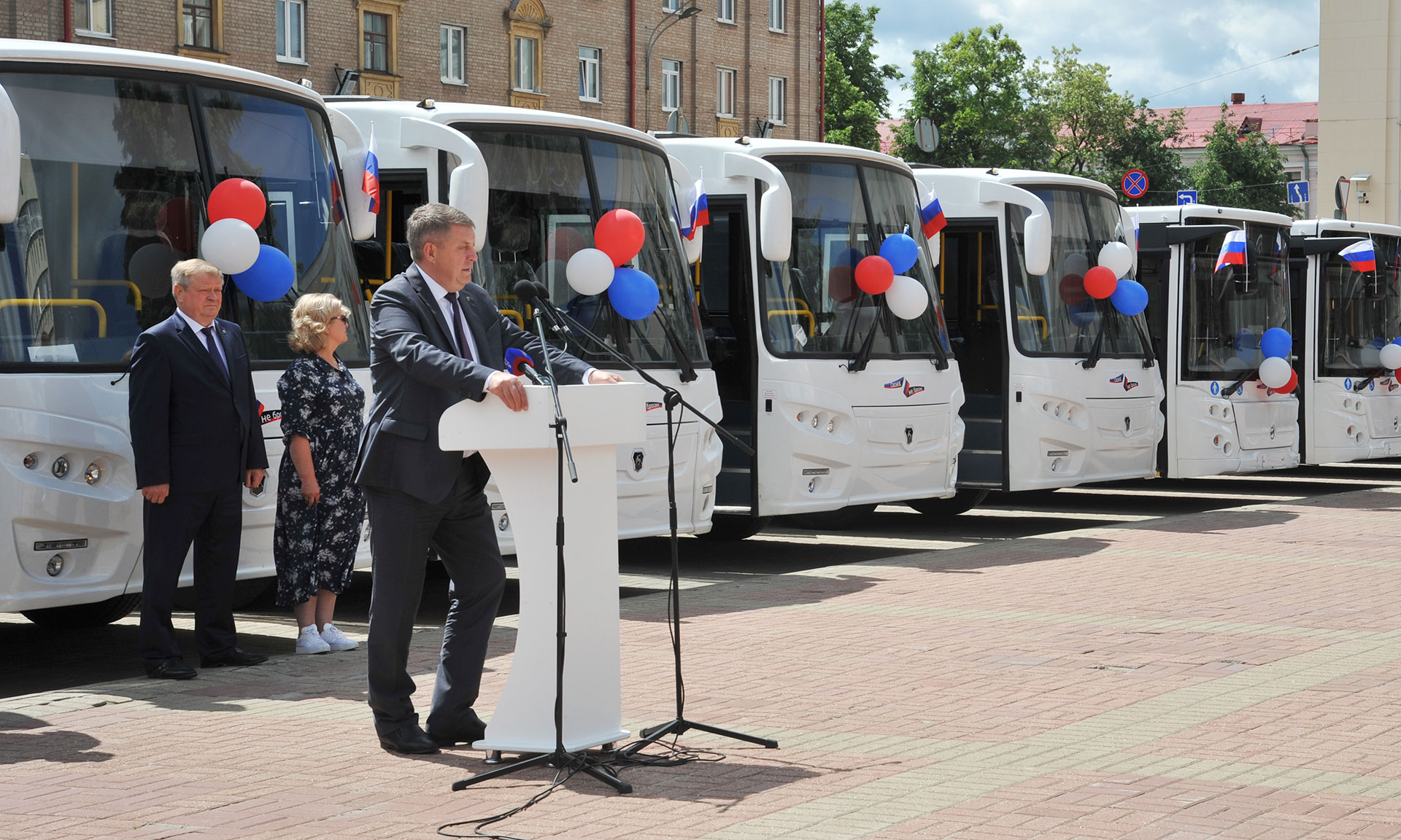 — Уважаемые представители автотранспортных предприятий Брянщины! Сегодня — очень яркий, знаменательный день и для города, и для области: 66 новых комфортабельных автобусов выходят в рейс. А это огромное подспорье нашим жителям, это комфортные перевозки людей!