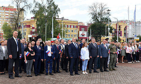 Почетное право поднять флаг Российской Федерации было предоставлено Губернатору Брянской области Александру Богомазу и отличнице в учебе, чемпионке города Брянки Луганской Народной Республики по гандболу Диане Сидоровой.