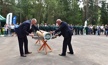 Затем Борис Грибанов и Виталий Беляй произвели символический отпил от бревна диска двуручной пилой.