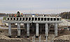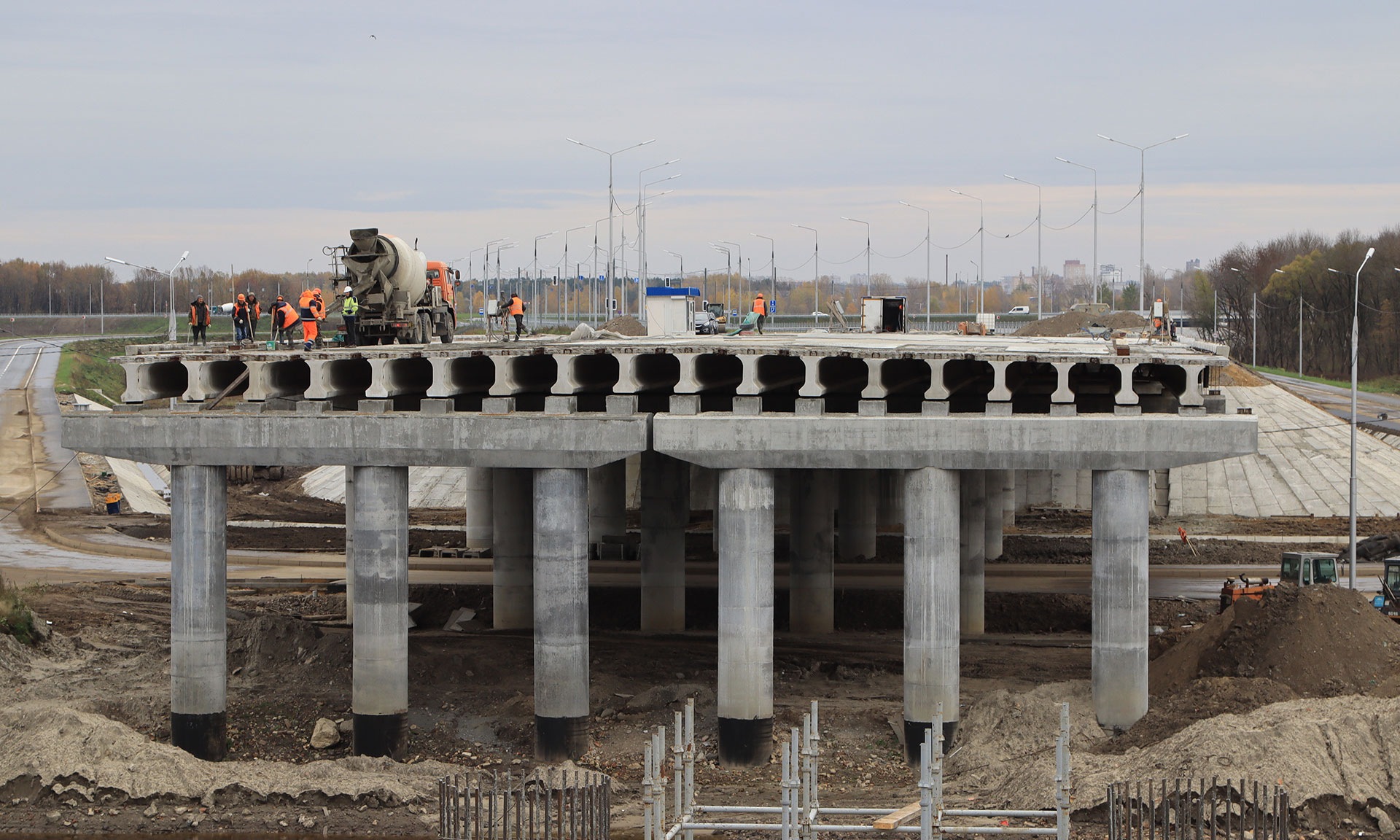 На I–IV пролетах (на стороне дороги-дамбы) укладывается выравнивающий слой бетона, производится его шлифовка, подготовка к устройству гидроизоляции. На подходе к мосту со стороны улицы Калинина участками устанавливается опалубка и продолжается бетонирование подпорной стенки.