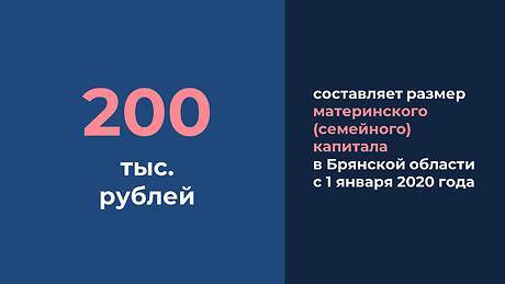 Размер материнского (семейного) капитала в Брянской области с 1 января 2020 года составляет 200 тыс. рублей. В семьях, в которых одновременно рождается двое детей (при условии, что один из рожденных детей — третий по числу рожденных матерью), размер областного материнского (семейного) капитала удваивается и составляет 400 тыс. рублей, а при рождении одновременно трех и более детей размер областного материнского (семейного) капитала составляет 1 млн 200 тыс. рублей. Количество семей, распорядившихся средствами областного материнского (семейного) капитала за 9 месяцев 2022 года составило 876 семей.