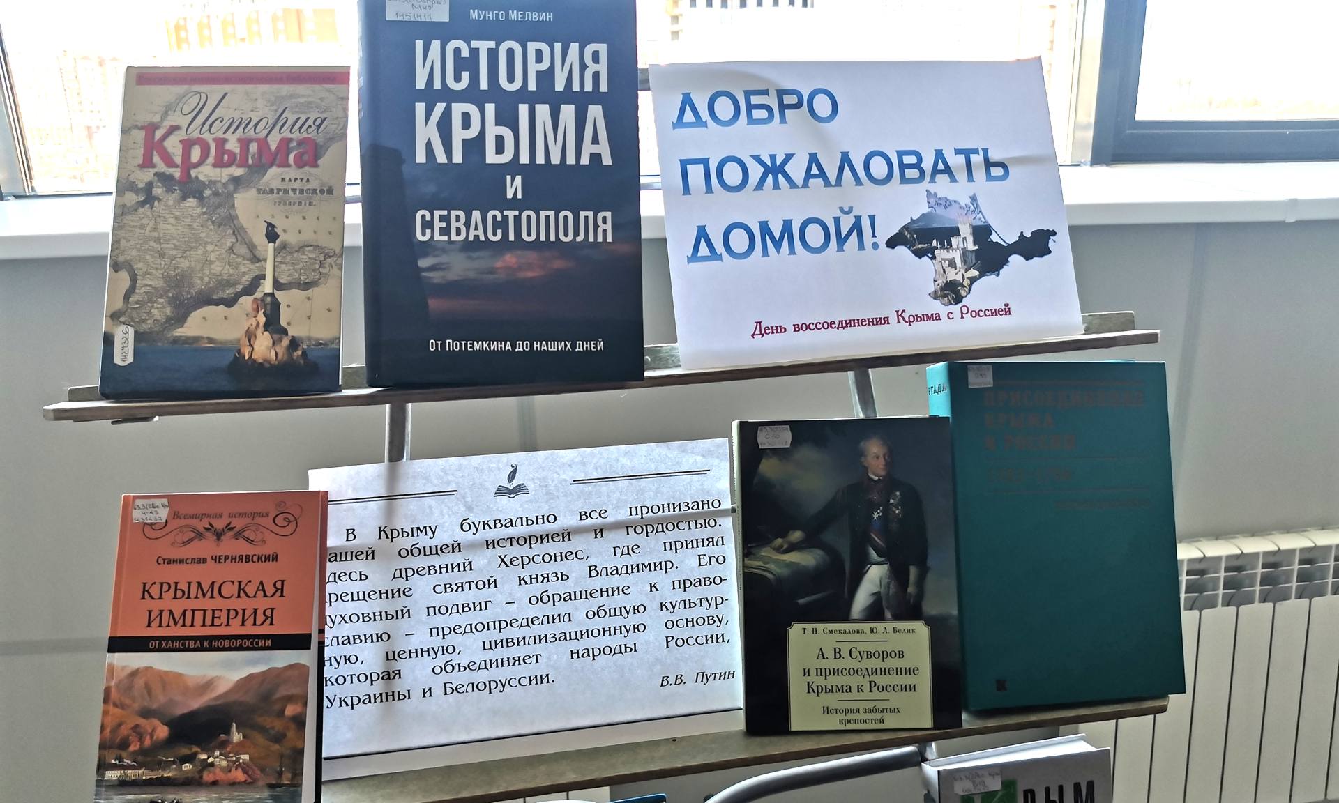 Брянская областная научная универсальная библиотека им. Ф. И. Тютчева познакомила зрителей с богатейшей историей полуострова Крым, начиная с 10 века и до наших дней. Особое внимание было уделено многолетней борьбе с завоевателями, важности полуострова для России, роли Крыма в Великой Отечественной войне и героической обороне Севастополя. На выставке представлены издания, рассказывающие о наиболее важных вехах крымской истории.
