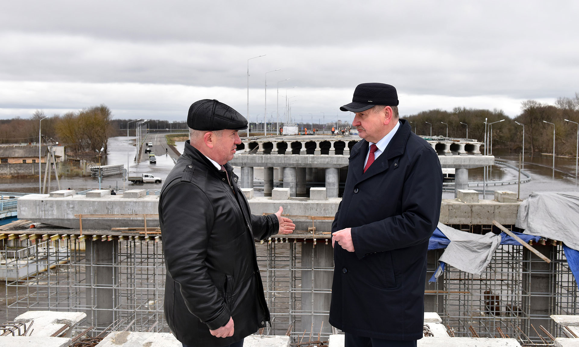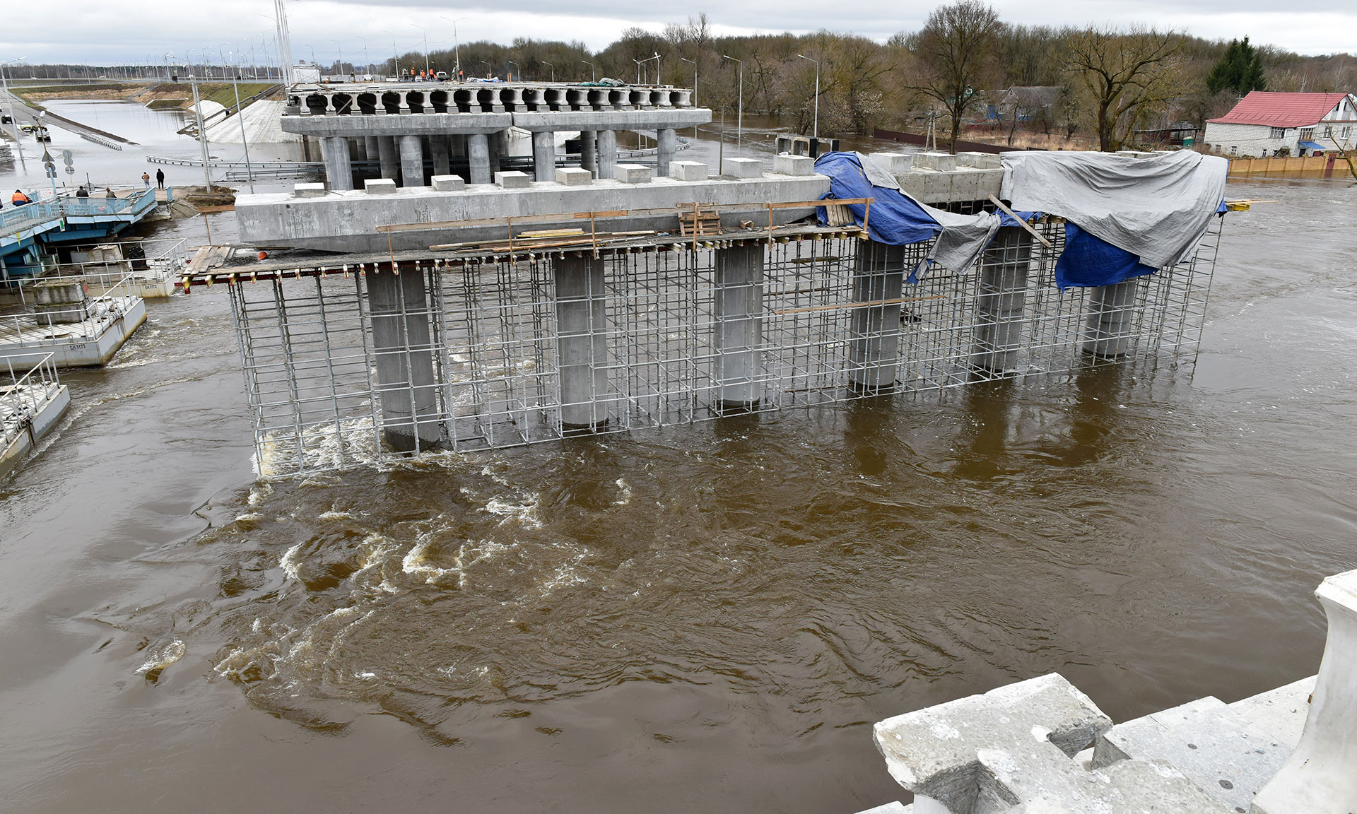На Славянском мосту продолжаются работы, несмотря на то, что в последние дни уровень воды в реке Десна существенно поднялся и продолжает подниматься в настоящее время. Однако из-за разлива реки пришлось вывести технику из русла и сосредоточиться на работах в верхней части моста — устройстве защитного слоя, бетонной стяжки по арматурной сетке и оклеечной гидроизоляции.