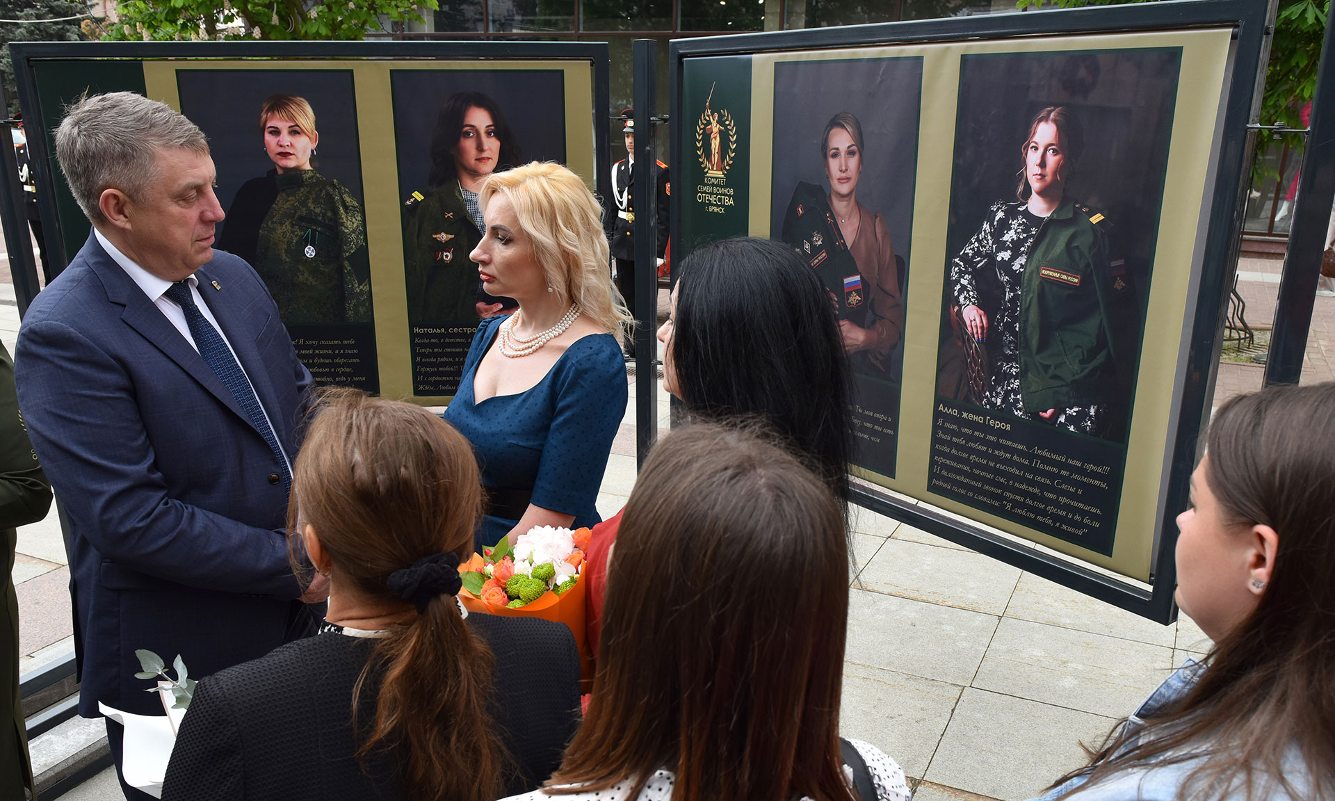 Перед началом выставки Губернатор Александр Богомаз пообщался с женами, матерями и сестрами военнослужащих. Губернатор отметил, что проект получил огромный отклик, и теперь одна за одной выставки открываются по всей стране, чтобы поддержать наших бойцов, которые сейчас защищают Родину, и отдать дань памяти Героям.