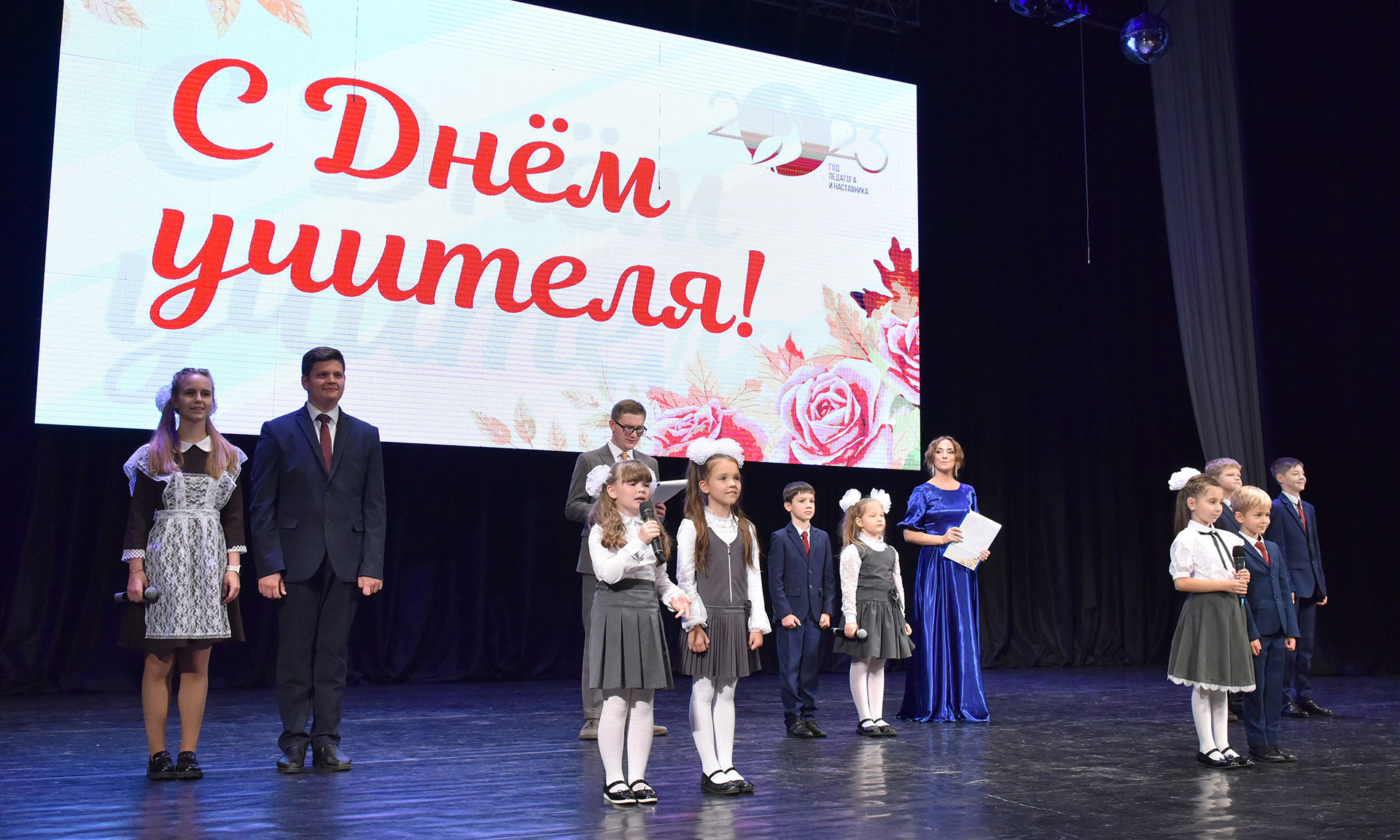 — Дорогие учителя, педагоги дошкольного и дополнительного образования, преподаватели средних и высших учебных заведений, дорогие ветераны отрасли! Я от всей души поздравляю вас с вашим профессиональным праздником, Днём учителя!