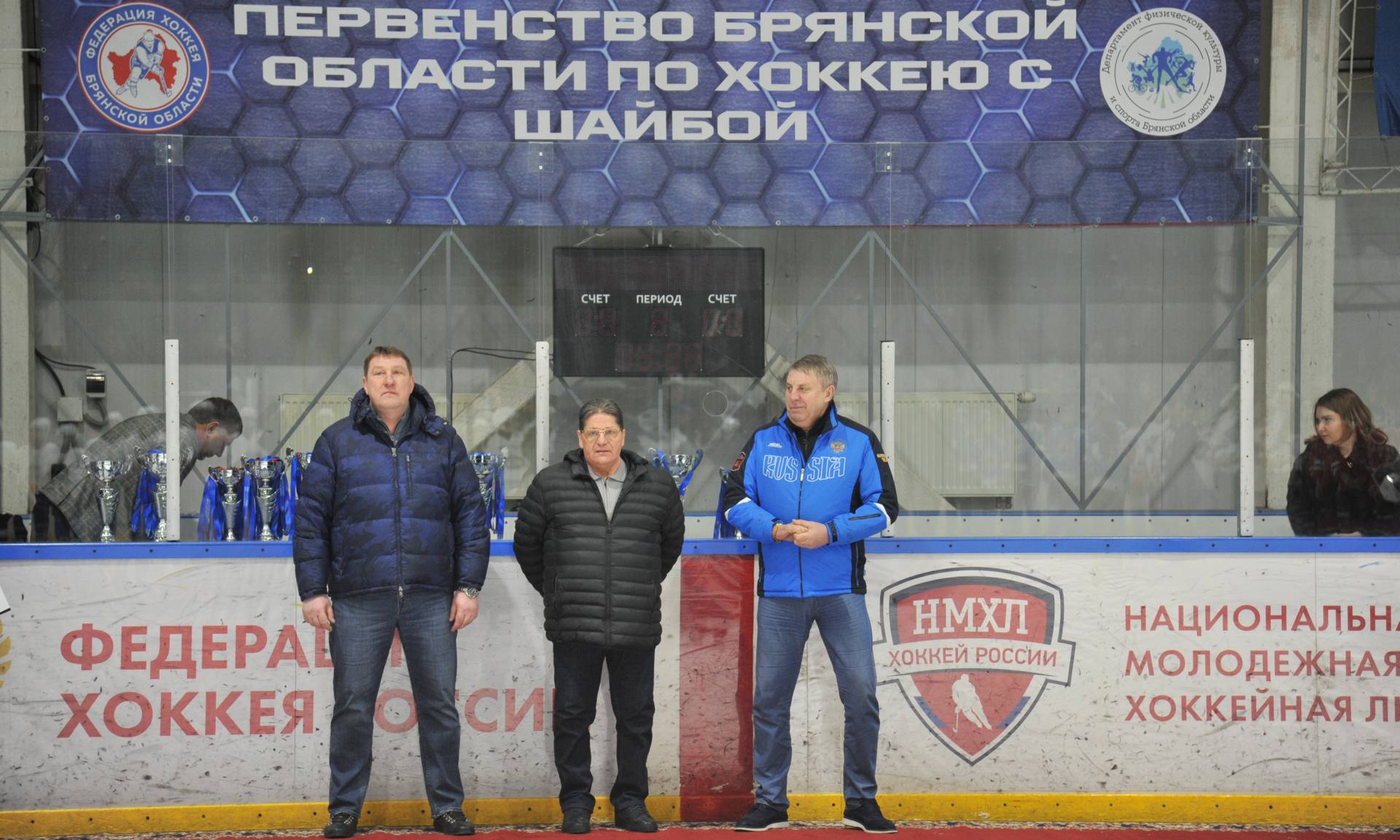 — Добрый день, дорогие друзья! Сегодня мы подводим итоги первенства Брянской области по хоккею среди детей. На этой арене состоится заключительный матч за первое и второе места. Мне очень приятно, что сегодня в Брянске, на этой арене присутствуют две легенды советского и российского хоккея. Рядом со мной Сергей Михайлович Макаров и Борис Олегович Миронов. Сергей Михайлович — двукратный олимпийский чемпион, 8-кратный чемпион мира, три года был обладателем «Золотой клюшки», лучшим нападающим мира того времени. Борис Олегович играл и в составе советской, и российской команды, двукратный призер олимпийских игр, чемпион мира, заслуженный мастер спорта России.