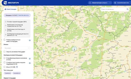 Карта позволяет искать площадки в разных регионах и сравнивать их возможности. Здесь собраны сведения о ключевых макроэкономических показателях субъектов России, которые могут оказать влияние на реализацию проекта. Все это позволяет оценивать затраты по проекту и подбирать меры государственной поддержки.