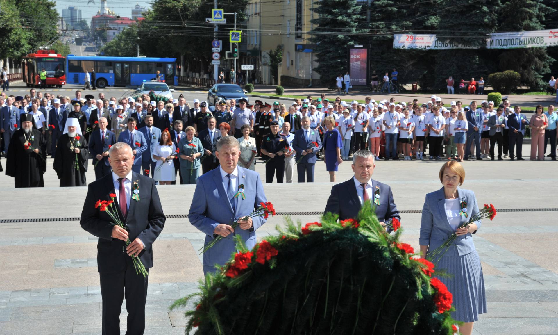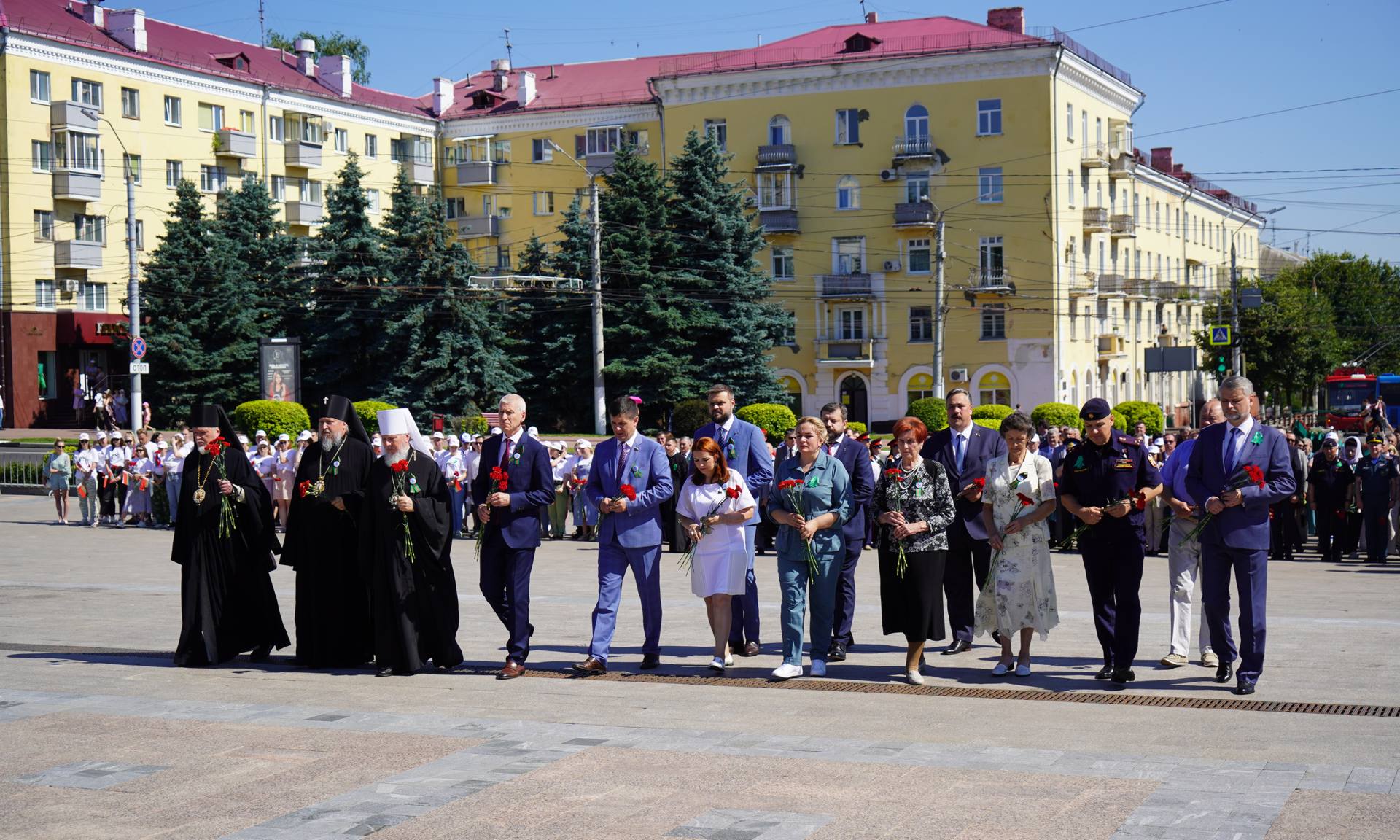 В церемонии возложения также приняли участие советник председателя Правительства Российской Федерации Олег Матыцин, заместитель начальника Управления по связям с соотечественниками и историко-мемориальной работе Федерального агентства по делам СНГ, соотечественников, проживающих за рубежом и по международному гуманитарному сотрудничеству Алексей Петров, главный федеральный инспектор по Брянской области Андрей Дьячук, Его Высокопреосвященство митрополит Брянский и Севский Александр, Его Высокопреосвященство архиепископ Гомельский и Жлобинский Стефан, Его Преосвященство епископ Клинцовский и Трубчевский Владимир, сенаторы Российской Федерации Галина Солодун и Вадим Деньгин, заместитель председателя комитета Государственной Думы по делам СНГ, евразийской интеграции и связям с соотечественниками, член Генерального совета Партии «Едина Россия» Артём Туров, Герой Российской Федерации Андрей Фроленков, матери погибших защитников Отечества Лидия Филипповна Ермакова, Галина Георгиевна Василёва, Марина Николаевна Седнева, руководители судебных, правоохранительных органов и силовых структур Брянской области, руководители территориальных органов федеральных органов исполнительной власти в Брянской области, заместители Губернатора Брянской области и депутаты Брянской областной Думы, руководители города Брянска, делегации республики Беларусь, Луганской и Донецкой народных республик, регионов России, почётные граждане Брянской области, области участники молодёжного Международного лагеря «Дружба-2024», молодёжного патриотического проекта «Дорогами памяти и славы», делегации районов Брянской области.