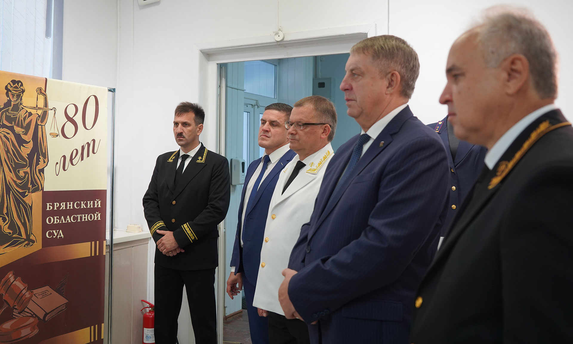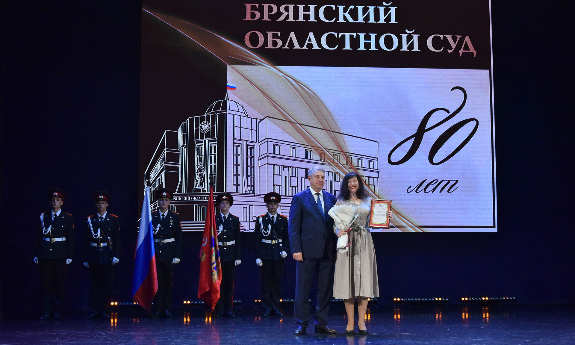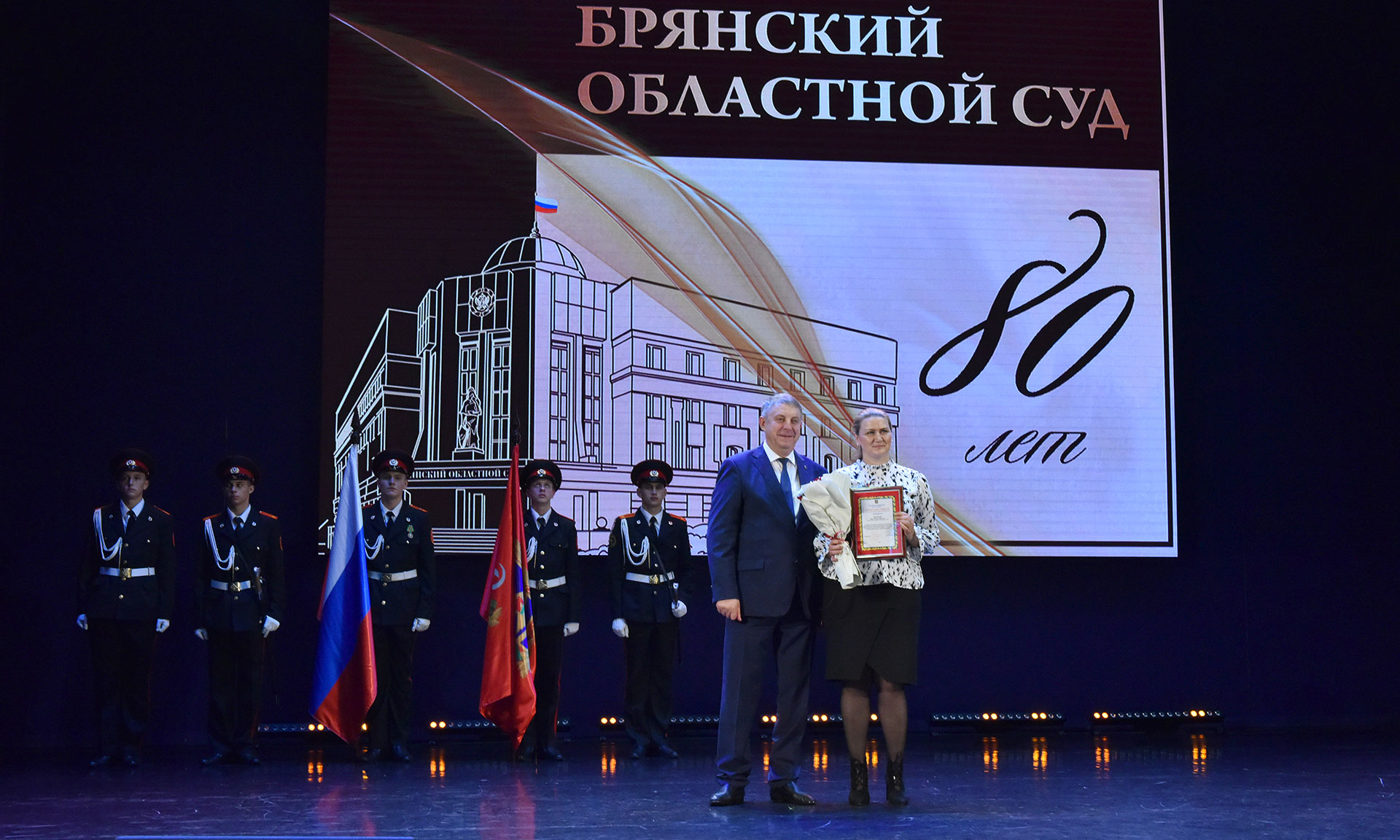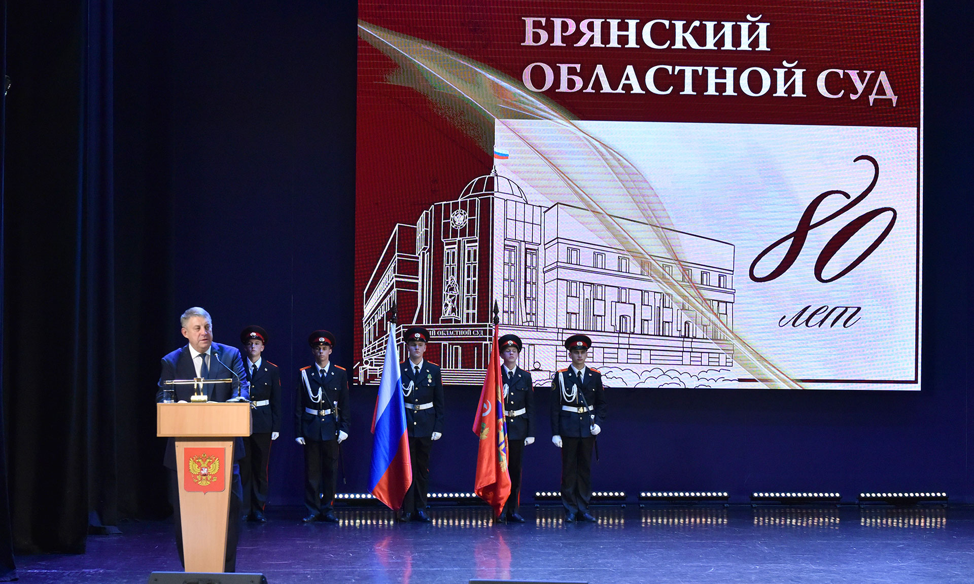 В Губернаторском Дворце детского и юношеского творчества имени Ю. А. Гагарина состоялось торжественное собрание, посвященное 80-летию образования Брянского областного суда. В числе его участников Губернатор Брянской области Александр Богомаз, председатель Брянского областного суда Александр Курганов, председатель Первого кассационного суда общей юрисдикции Сергей Шараев, председатель Курского областного суда Олег Кравченко, заместитель председателя Брянской областной Думы Владимир Пронин, федеральный инспектор по Брянской области Игорь Фильченков, заместитель председателя Арбитражного суда Брянской области Александр Назаров, и.о. прокурора Брянской области Руслан Коберник, начальник управления ФСБ России по Брянской области Сергей Воронин, начальник управления МВД России по Брянской области Алексей Солдатов, и.о. руководителя Следственного управления Следственного комитета Российской Федерации по Брянской области Сергей Старов, заместитель начальника управления Федеральной службы войск национальной гвардии Российской Федерации по Брянской области Андрей Борисов, начальник главного управления МЧС России по Брянской области Дмитрий Енин, врио начальника пограничного управления ФСБ России по Брянской области Амир Амиров, начальник Центра специальной связи и информации Федеральной службы охраны Российской Федерации в Брянской области Олег Бельский, руководитель управления Федеральной службы судебных приставов по Брянской области — главный судебный пристав Брянской области Елена Бывшева, начальник управления ФСИН России по Брянской области Алексей Мишанов, начальник Брянской таможни Сергей Санакоев, руководитель управления ФНС России по Брянской области Андрей Маркелов, военный комиссар Брянской области Ильфат Абзалов, заместитель председателя Брянского областного суда Елена Ендовицкая, судья Первого апелляционного суда общей юрисдикции Елена Стоян, начальник УСД в Брянской области Эдуард Аблязов, военный прокурор Брянского гарнизона Александр Чеховских, начальник управления Министерства юстиции Российской Федерации по Брянской области Наталия Рудакова, начальник Управления мировой юстиции Брянской области Виктор Снытко, президент Брянской областной нотариальной палаты Елена Гришина, сотрудники и ветераны судебной системы.