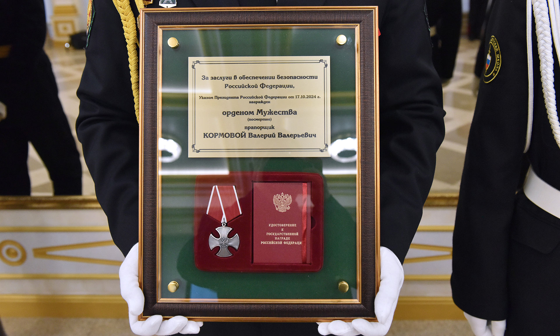 За проявленные мужество, самоотверженность, отвагу и заслуги в обеспечении безопасности Российской Федерации Указом Президента Российской Федерации от 17 октября 2024 года № 894 прапорщик Кормовой Валерий Валерьевич посмертно награжден Орденом Мужества.