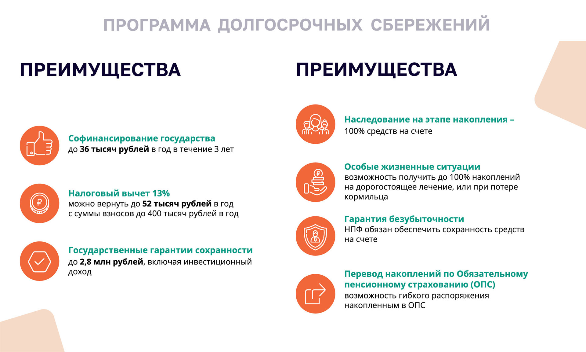 Новый механизм предусматривает различные стимулирующие меры для участников программы, в том числе дополнительное софинансирование со стороны государства до 36 тысяч рублей в год. Кроме того, участники системы смогут оформить ежегодный налоговый вычет до 52 тысяч рублей при уплате взносов до 400 тысяч рублей в год.