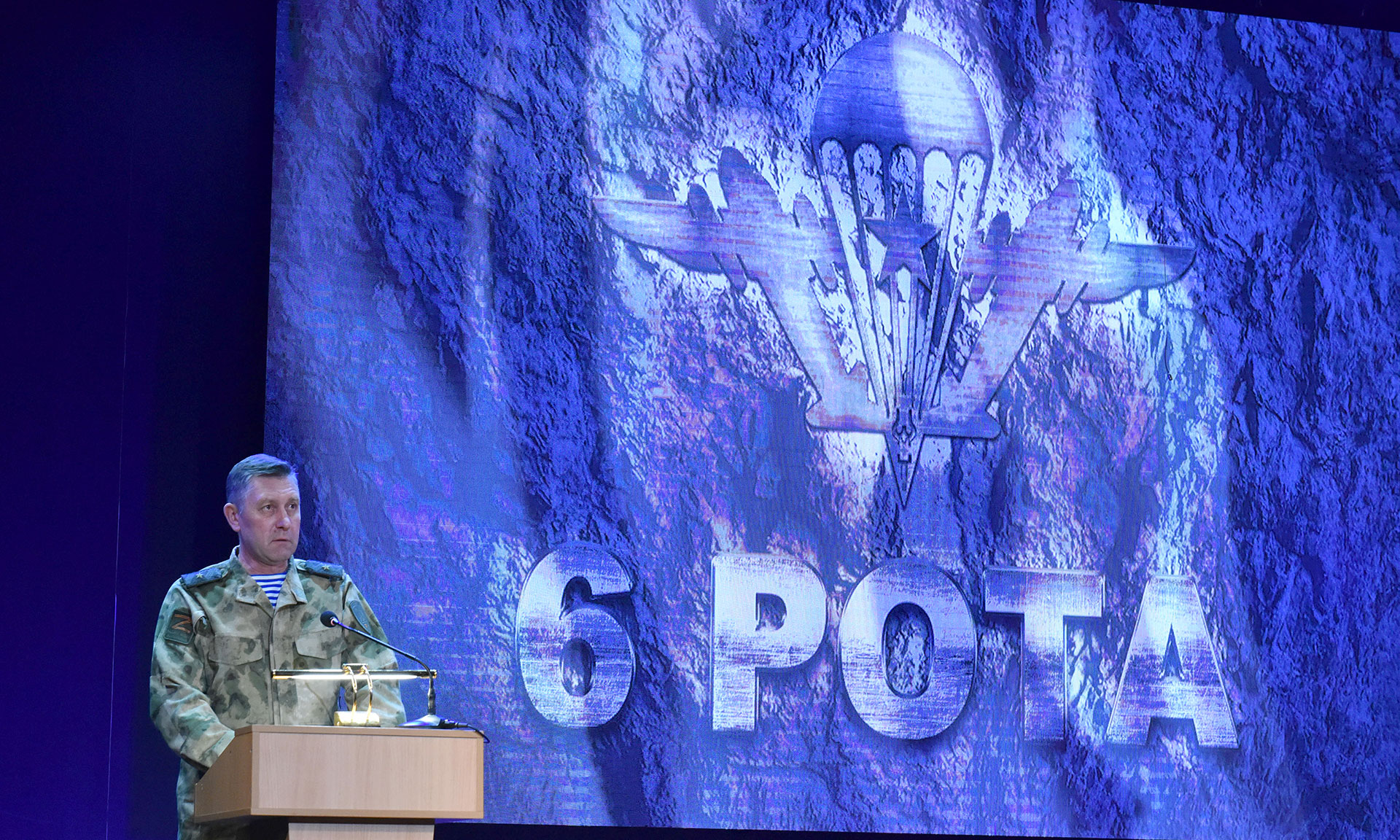 Но прошло 20 с лишним лет, и вновь наши заклятые соседи обратили взгляд на нашу Россию. И теперь уже встали братья, племянники, новое поколение ребят 6-й роты. Они стали защищать нашу Россию от этой фашистской напасти, чтобы никто не смог топтать нашу землю, чтобы было разрешено нашему русскому народу быть самобытным. Пока будет связь поколений, пока память в наших сердцах о настоящих героях будет жить, никто и никогда нашу Россию не поставит на колени! Давайте посмотрим в лица десантников 6-й роты, которые подарили нам мир на тот момент. И объявим минуту молчания.