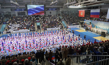 Сегодня мы с вами собрались в этом замечательном Дворце единоборств имени Артема Осипенко, чтобы отметить 11 лет с того исторического момента, когда Крым и Севастополь вернулись в свою родную гавань, в Россию. Я от всей души поздравляю вас, а в вашем лице всех жителей Брянской области с этой знаменательной датой!