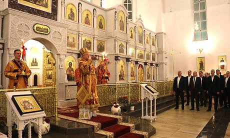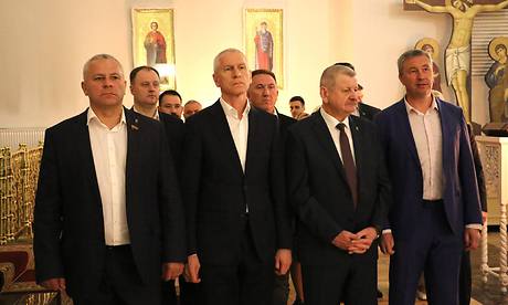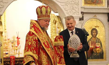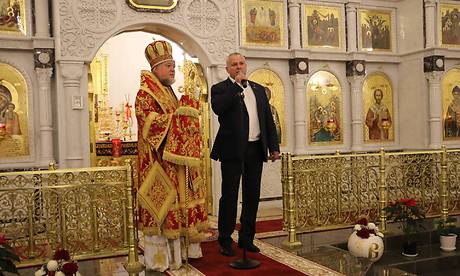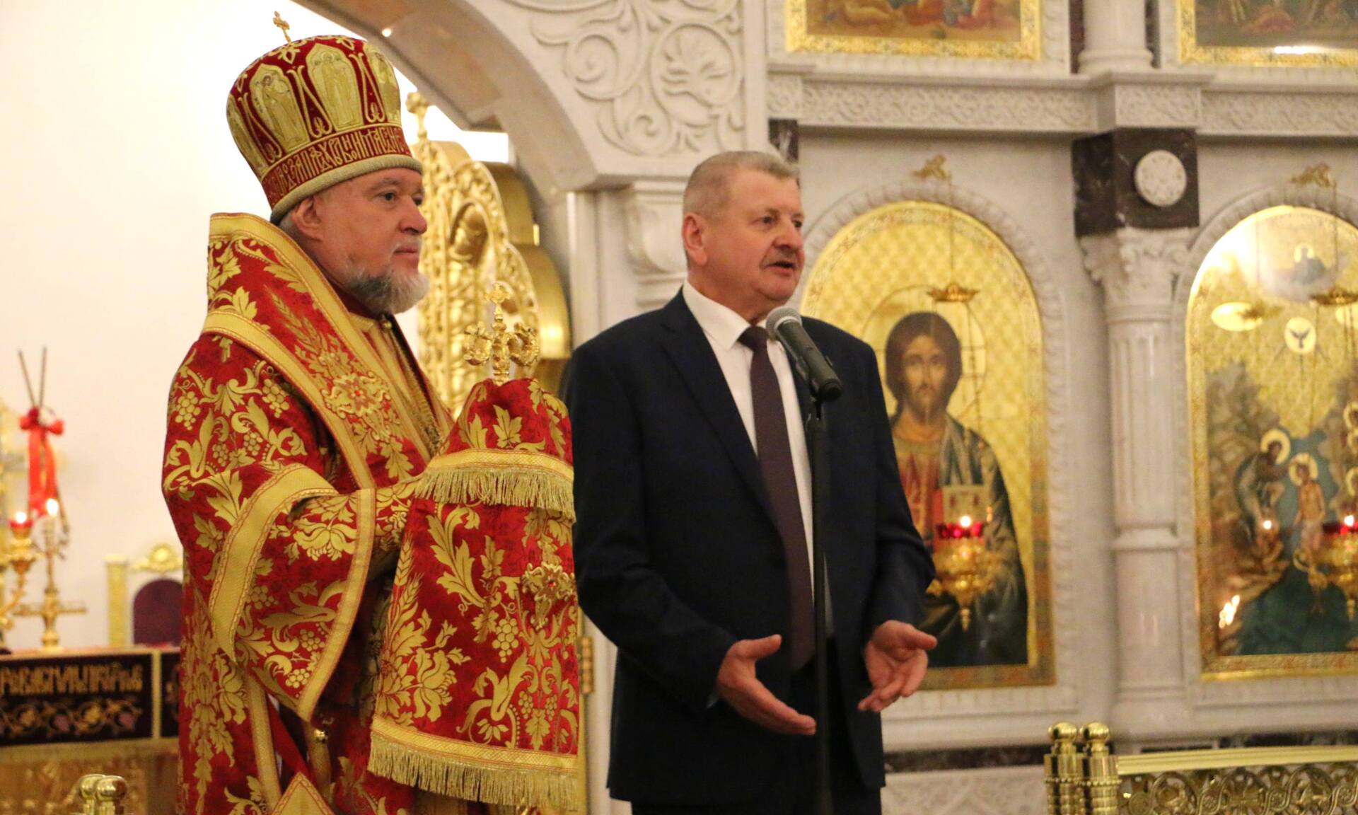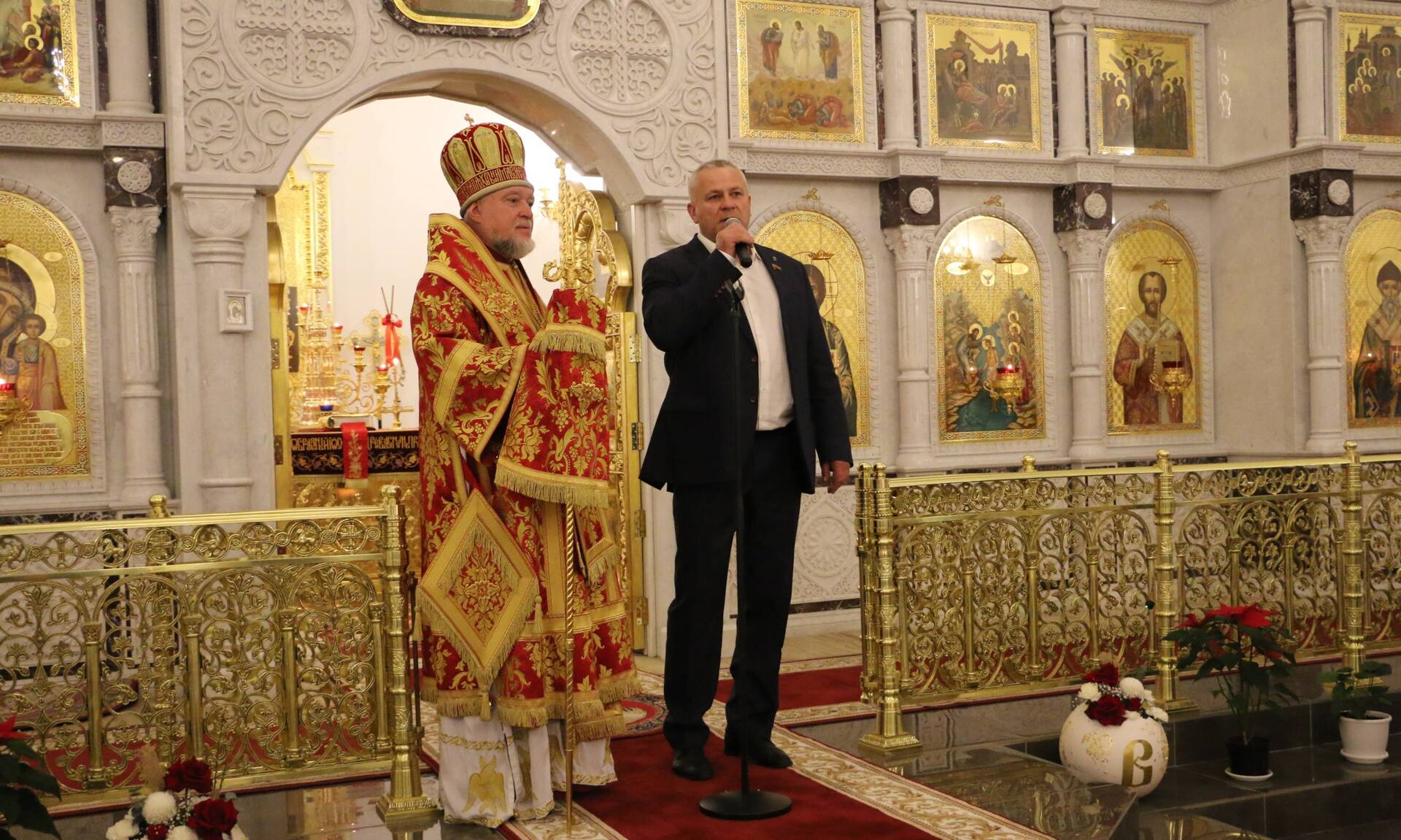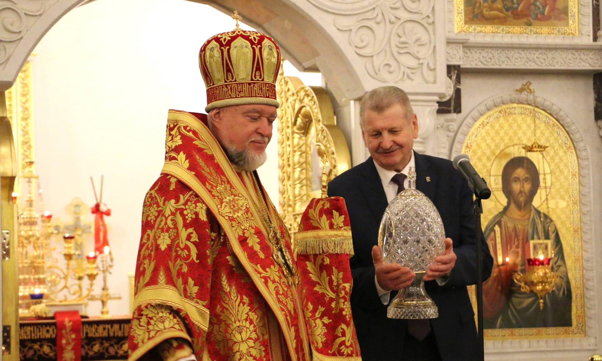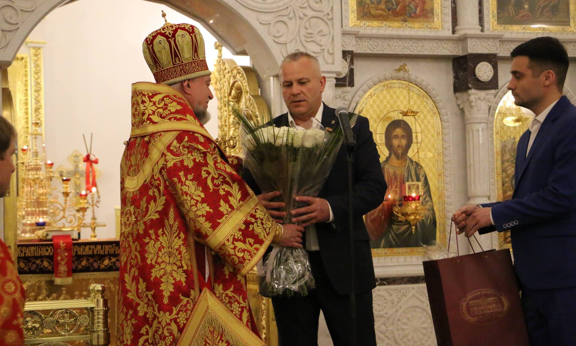 Николай Симоненко и Олег Матыцин присоединились к поздравлениям, вручили ответные подарки и белые розы Владыке Владимиру, пожелав здоровья и благополучия ему и всем прихожанам.