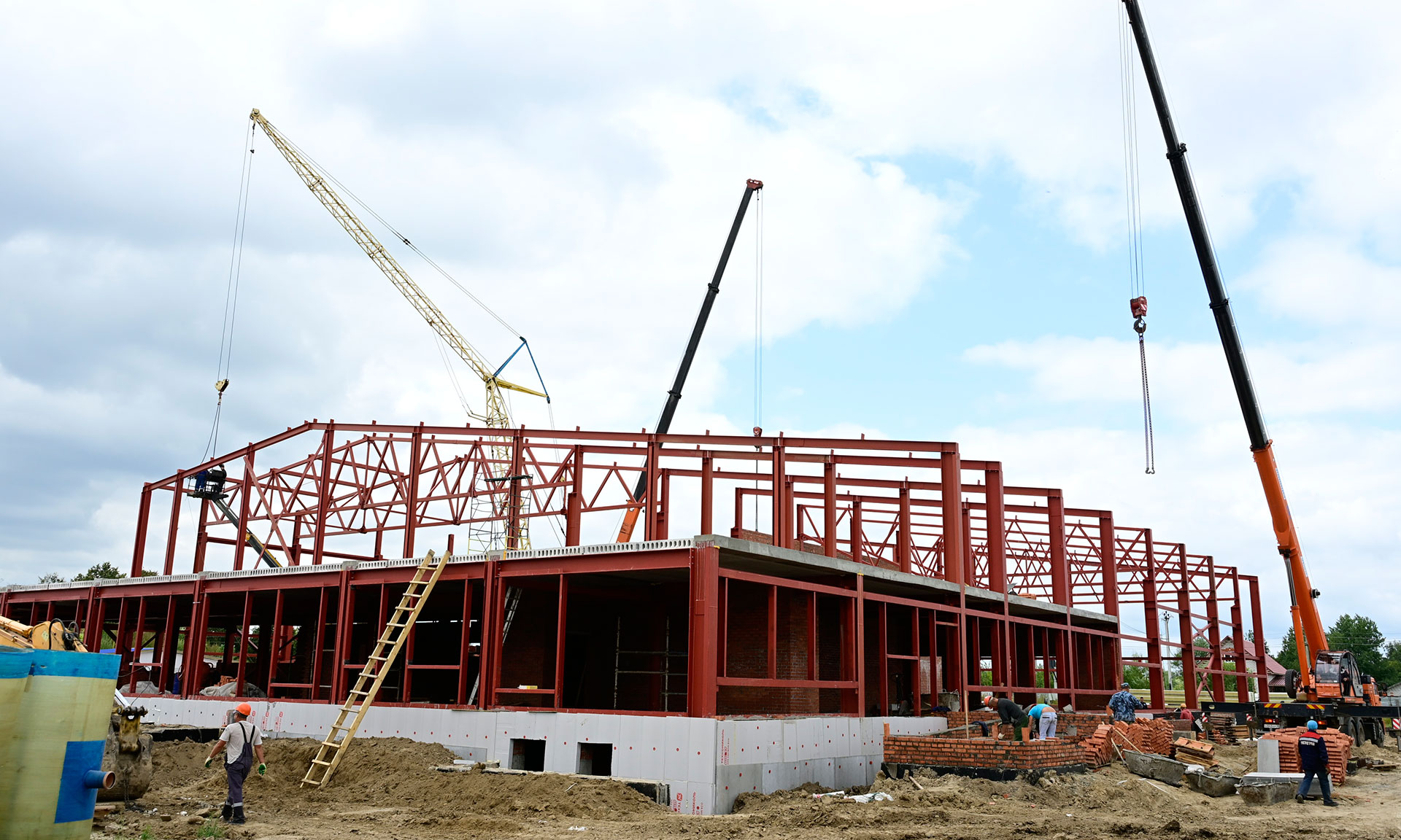 Сейчас ведутся работы по устройству металлического каркаса здания, установке колонн, панелей перекрытия, отоплению — котельная уже есть. Закуплен весь необходимый материал — металл, сэндвич-панели, монтаж начнется со следующей недели. Пока позволяет погода, строители приступят к благоустройству территории.