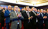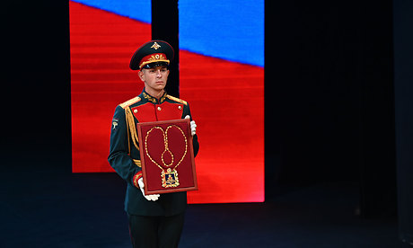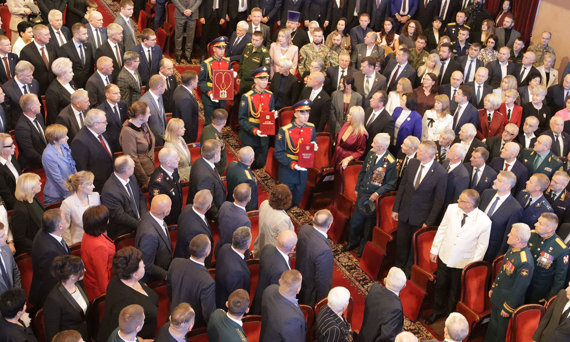 В зал были внесены Конституция Российской Федерации и Устав Брянской области, а также символ Губернаторской власти Брянской области — Знак Губернатора Брянской области.