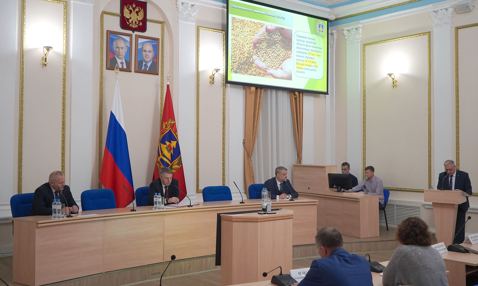На совещании обсудили итоги озимого сева зерновых культур и озимого рапса в наших сельхозпредприятиях. Директор департамента сельского хозяйства Сергей Симоненко сообщил, что по прогнозу сев озимых культур под урожай 2026 года предстояло провести на площади 205 тыс. га, фактически посеяно почти 210 тыс. га. По посевной площади озимого рапса под урожай 2026 года Брянская область на 2 месте в России. За последние 7 лет площади под озимым рапсом в области увеличились почти в 10 раз — с 8,9 тыс. га до 90,9 тыс. га. Погода, когда в августе сеяли озимый рапс, была идеальна по температуре, влажности — сейчас культура имеет потенциал урожая для следующего года 50–60 ц/га.