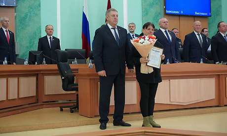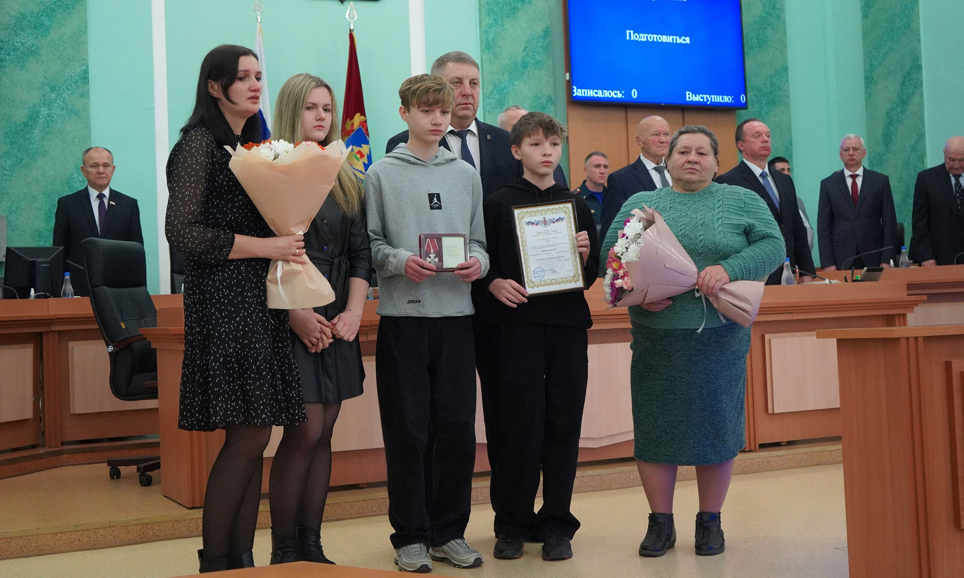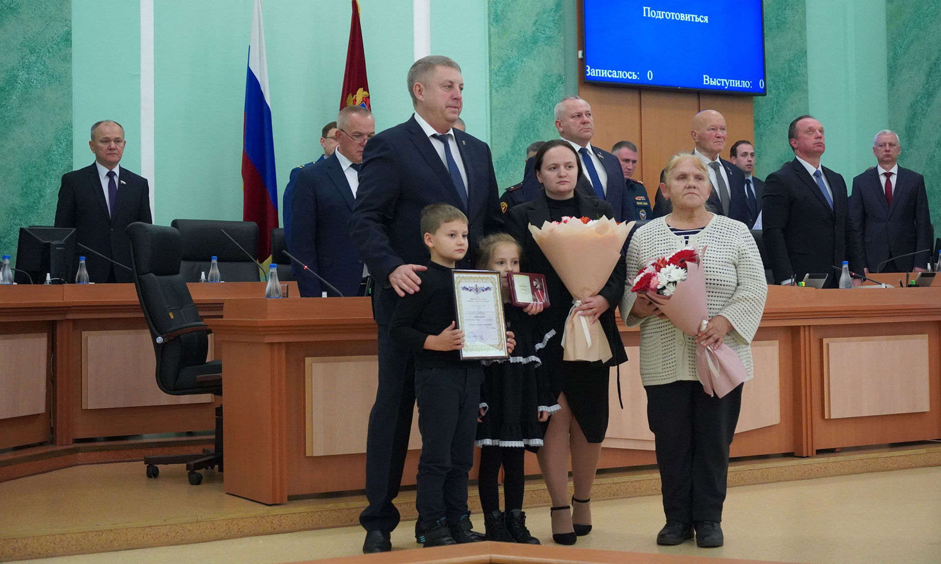 Перед обсуждением основной повестки заседания Александр Богомаз вручил родным Героев государственные награды. За мужество, отвагу и самоотверженность, проявленные при исполнении воинского долга, орденом Мужества посмертно награждены Александр Сергеевич Байдак, Александр Александрович Зубарь, Николай Михайлович Король, Илья Александрович Сиваков, медалью «За храбрость» II степени — Игорь Владимирович Пронин.