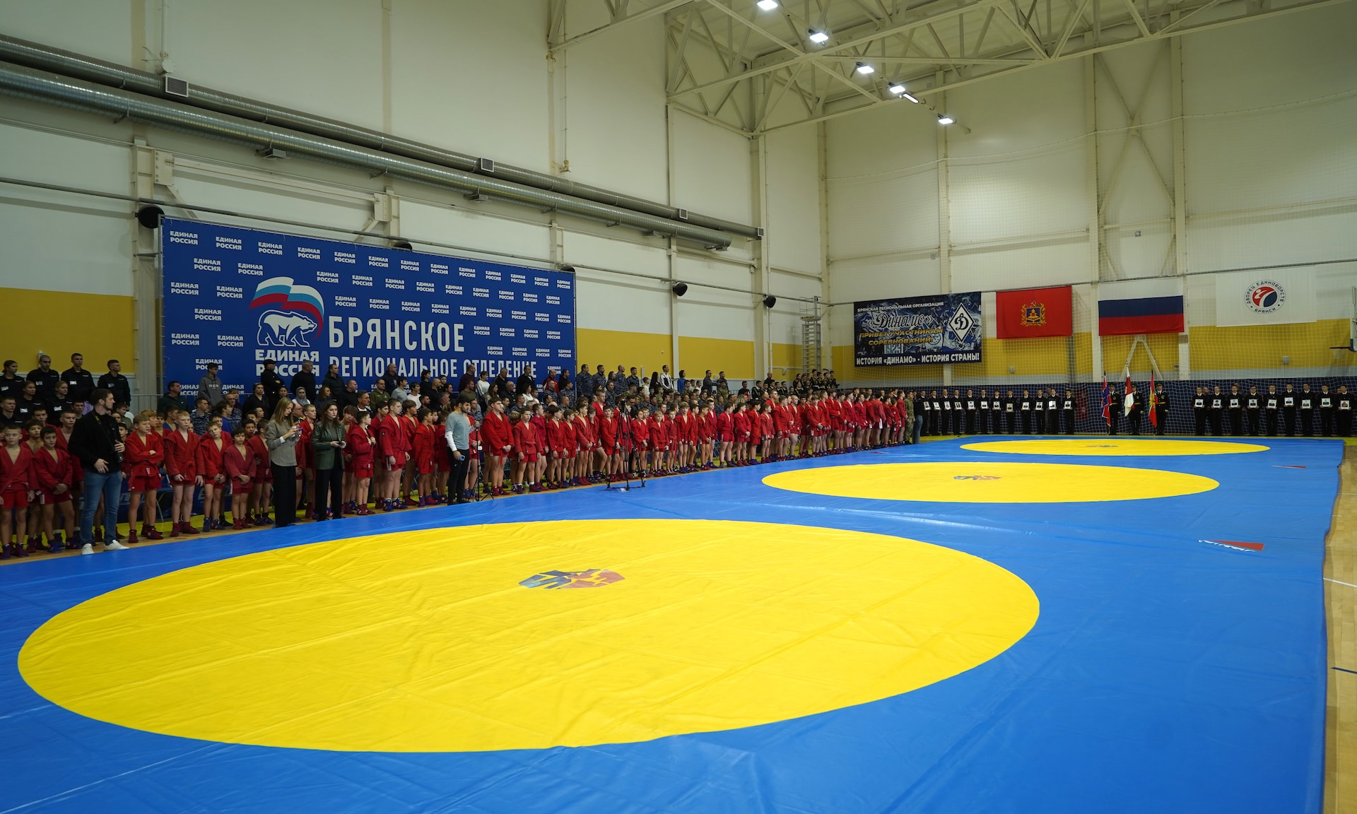 Соревнования проходят в одном из лучших спортивных сооружений нашей страны, во Дворце единоборств имени Артема Ивановича Осипенко. Это еще раз говорит о том, что для того, чтобы воспитать настоящих защитников, нам нужно, чтобы наши дети занимались спортом. И один из таких видов спорта — это, конечно же, самбо, наш национальный вид спорта, самооборона без оружия.